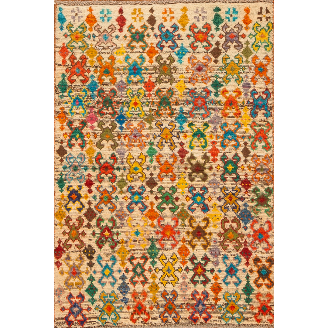 Bring a burst of color to your space with this stunning tribal area rug. Featuring a soft cream background with a dynamic, colorful overlay, this rug balances subtle elegance with bold vibrancy. Hand-knotted with quality, durable wool and sustainably sourced from around the globe.