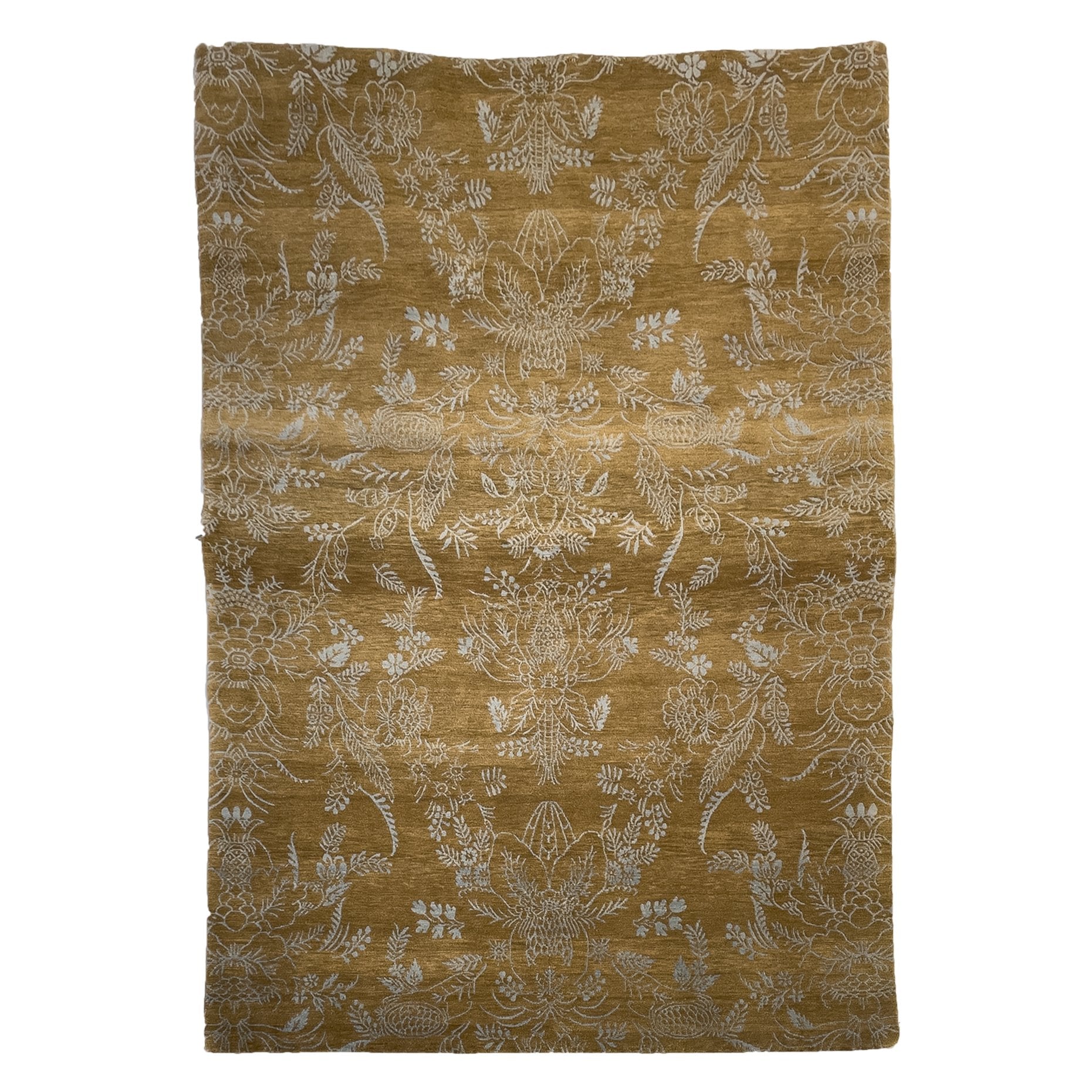 Large-scale floral motifs are outlined in ice blue upon a contrasting golden field. Beautifully hand-knotted in Nepal of the finest pure Tibetan wool, this old-world design is infused with a subtle yet contemporary palette.