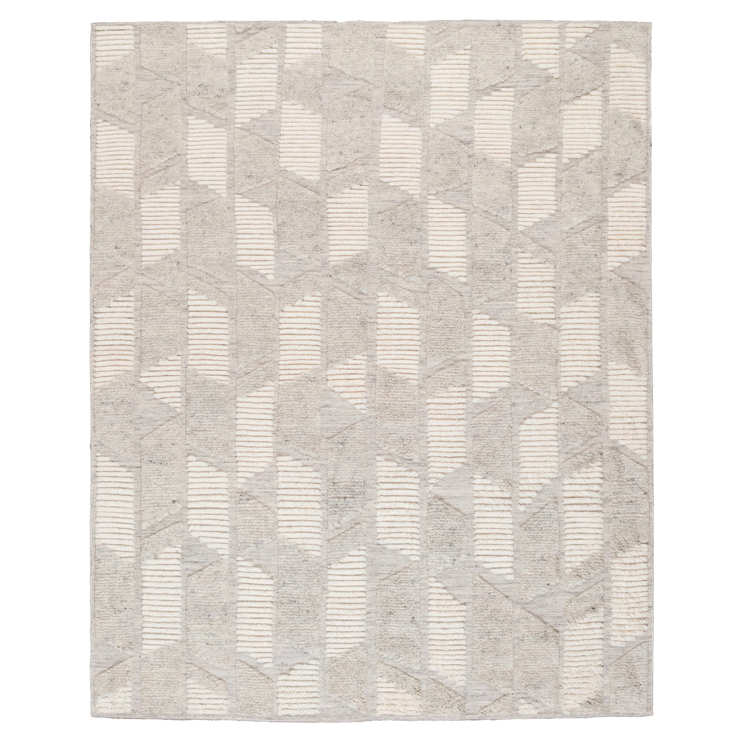 The Misha rug is a beautiful study in contrasting elements, pairing a sleek geometric pattern with sumptuously soft textures. Hand-knotted, naturally dyed, 100% wool yarns add varied depth to the rug, resulting in a piece that is both chic in style and plush under feet.