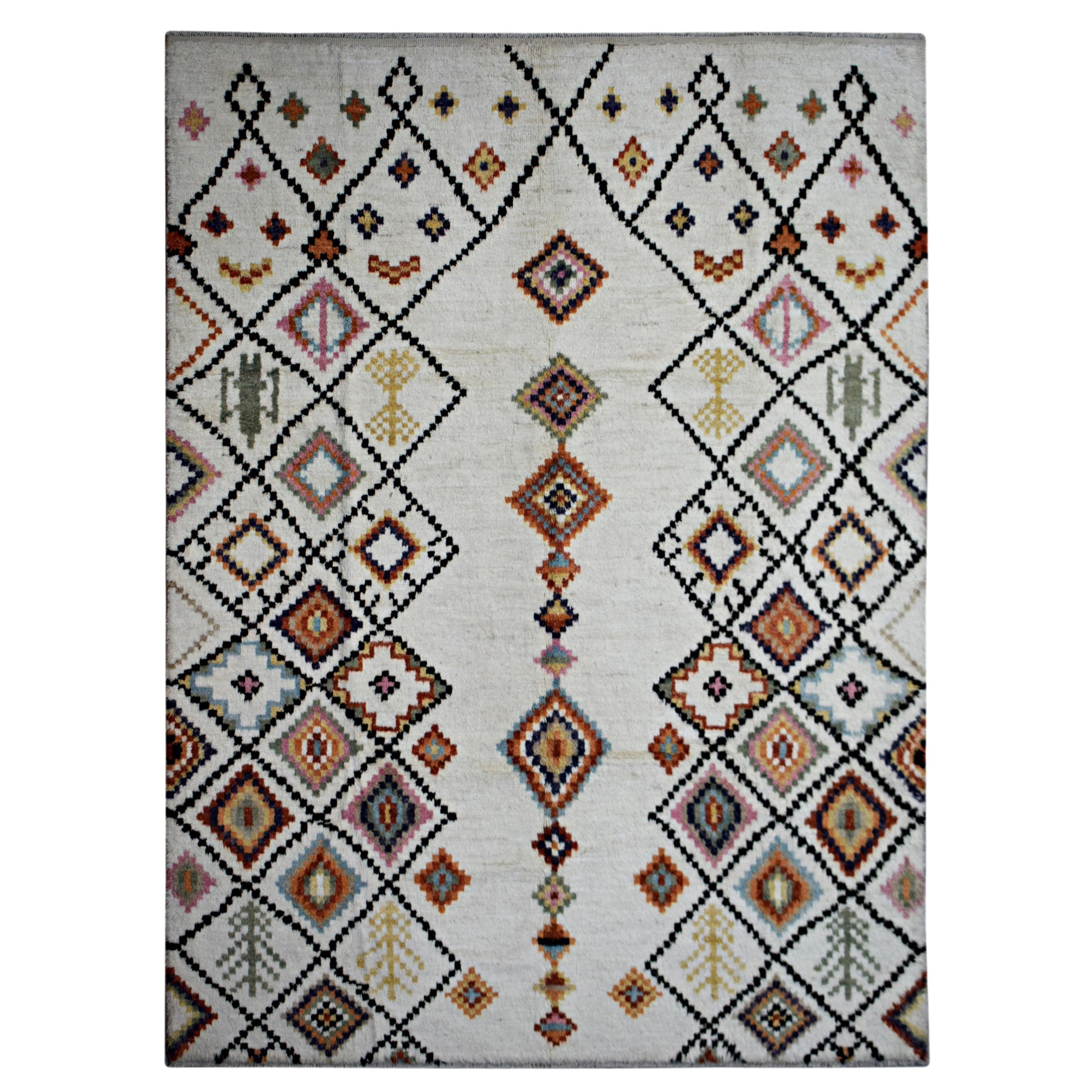 Add warmth, texture, and global style to your home with this Moroccan-style area rug. Designed with a long, plush pile, this rug features a stunning tribal diamond pattern in vibrant colors set against a neutral background, blending modern comfort with timeless Moroccan artistry.