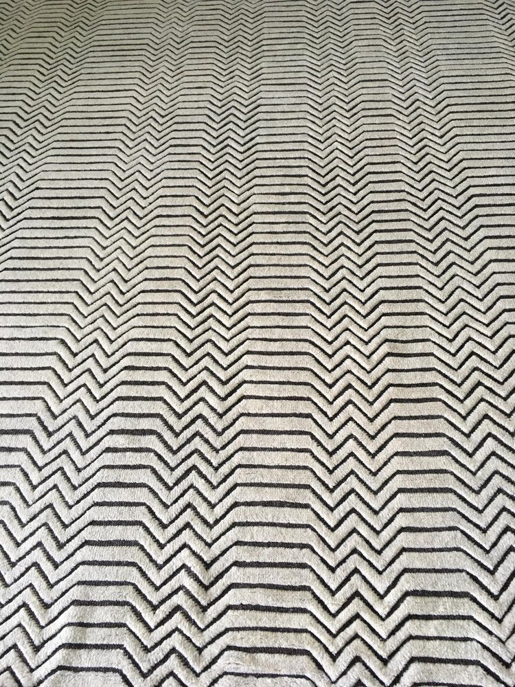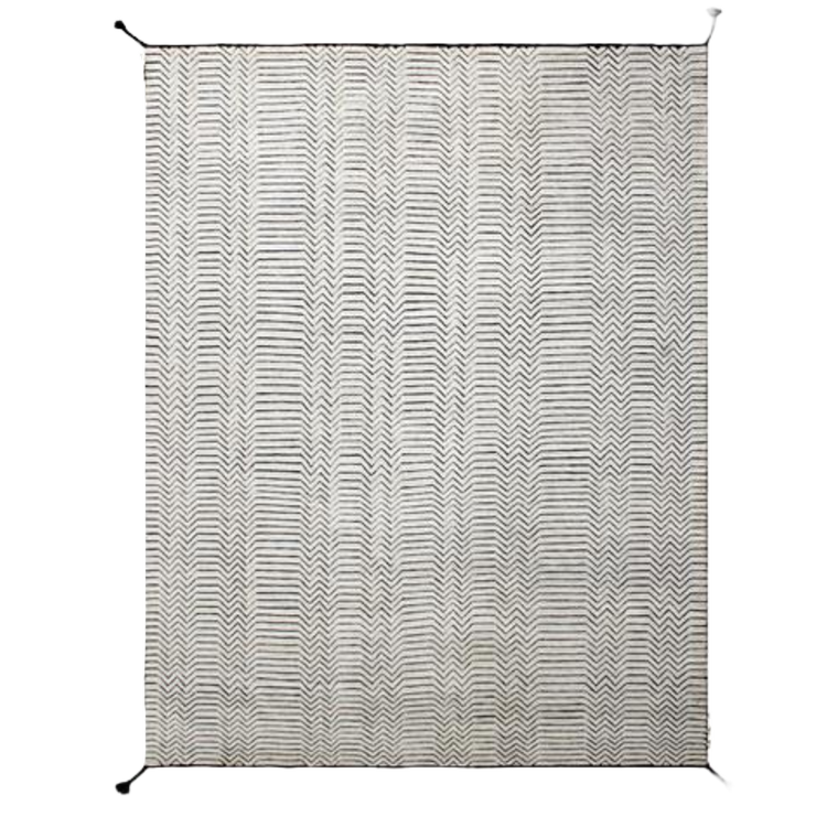 A chevron-style Hand-knotted rug from India in a beautiful cream and dark brown 100% wool that is as durable as it is lovely. Corner tassels and a variated pile add decorative details to the solid graphic design. The soft pile makes this rug perfect for a family or bedroom.
