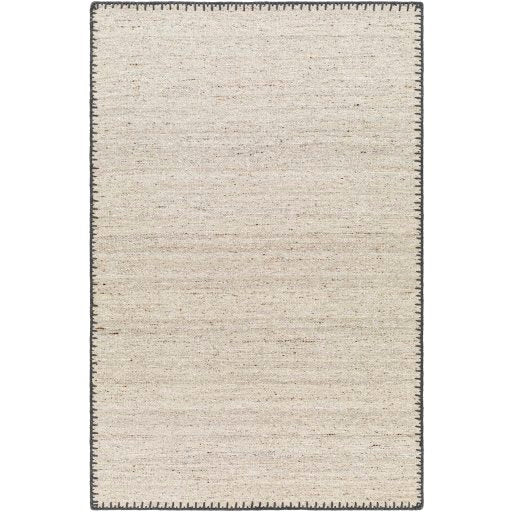 This Berghain area rug brings worldly sophistication to your home. The solid ecru area rug is finished with a contrasting stitched border. Hand-woven with wool in India, the textured style of this flat-weave rug makes a casual yet modern impact.
