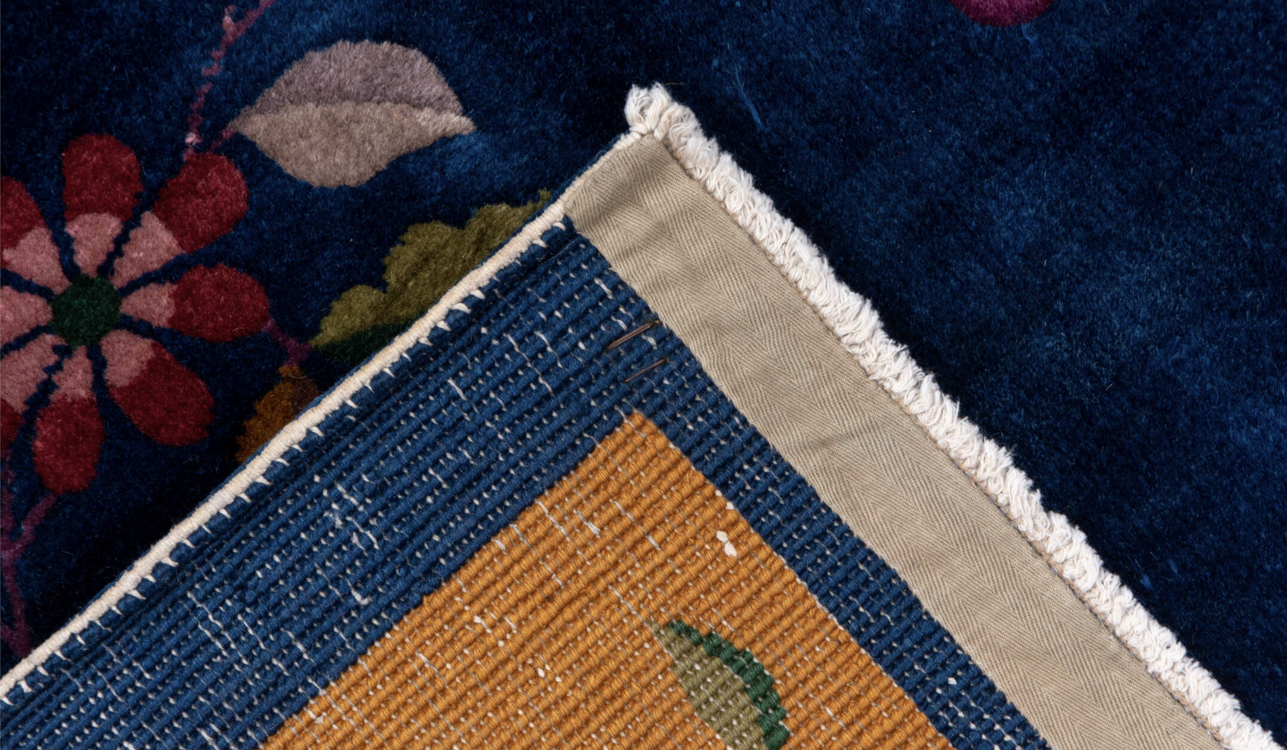 Blooming floral Chinese Area Rug, hand-knotted Circa 1930s. An orange border frames the deep indigo field layered with vibrant floral vines that interrupt the symmetry for a sophisticated look.