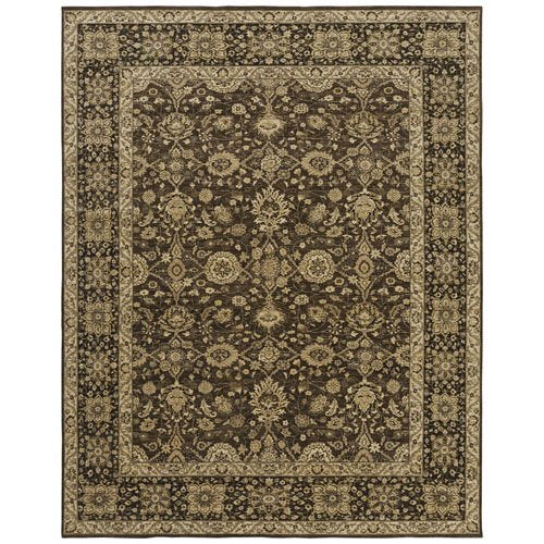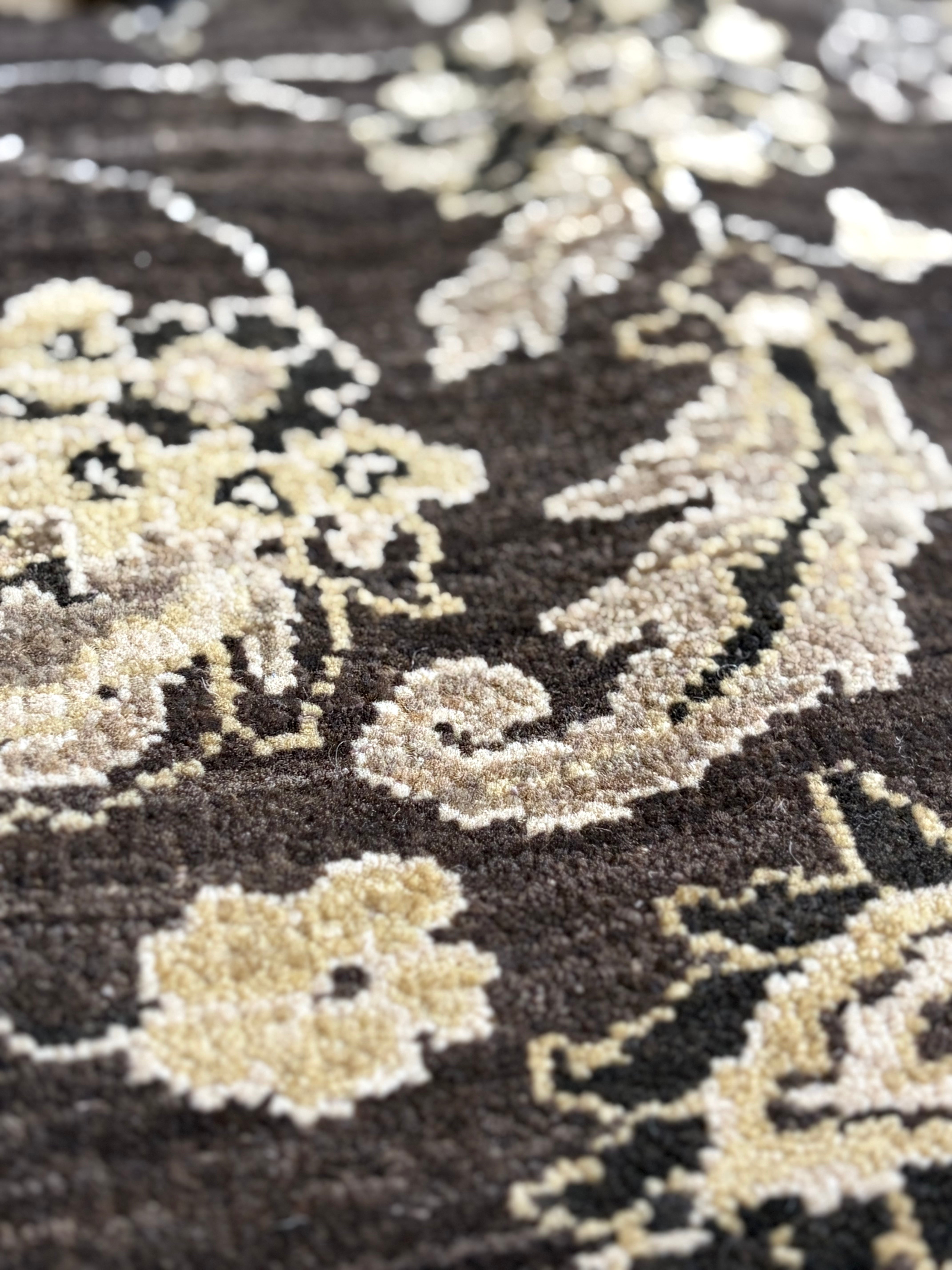 Repeating floral motifs and a traditional border embrace this classic design with a dynamic pattern for any modern or traditional interior. Hand-knotted from 100% wool, this area rug features an espresso-hued ground heavily decorated with serrated leaves, palmettes, and angular branches in cream and goldenrod hues. The border of the weaving vinery frames the central composition.