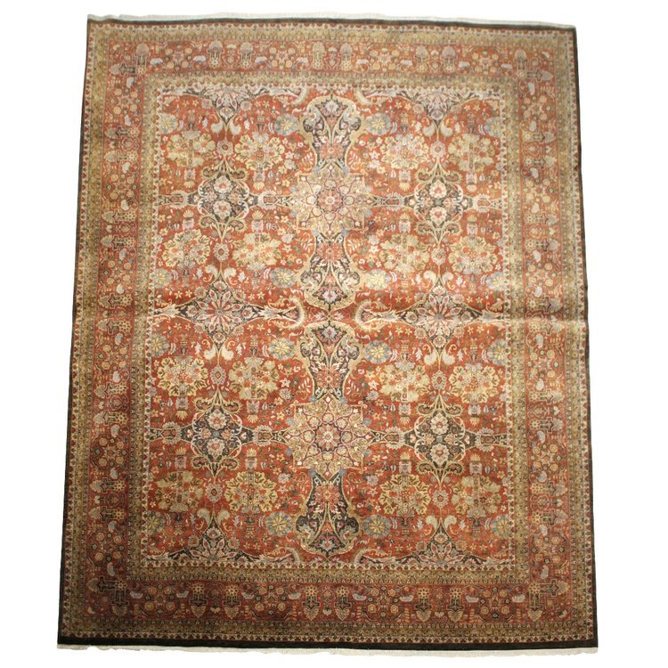 Reminiscent of vintage Persian city carpets, this area rug breathes new life into classic masterpieces. This traditional delicate and intricate design, rich in detailed floral motives, is colored in a warm pallet, highlighting the harmonious blend of floral and architectural elements. A rust background and border highlight a generous application of golds, reds, greens and blues.