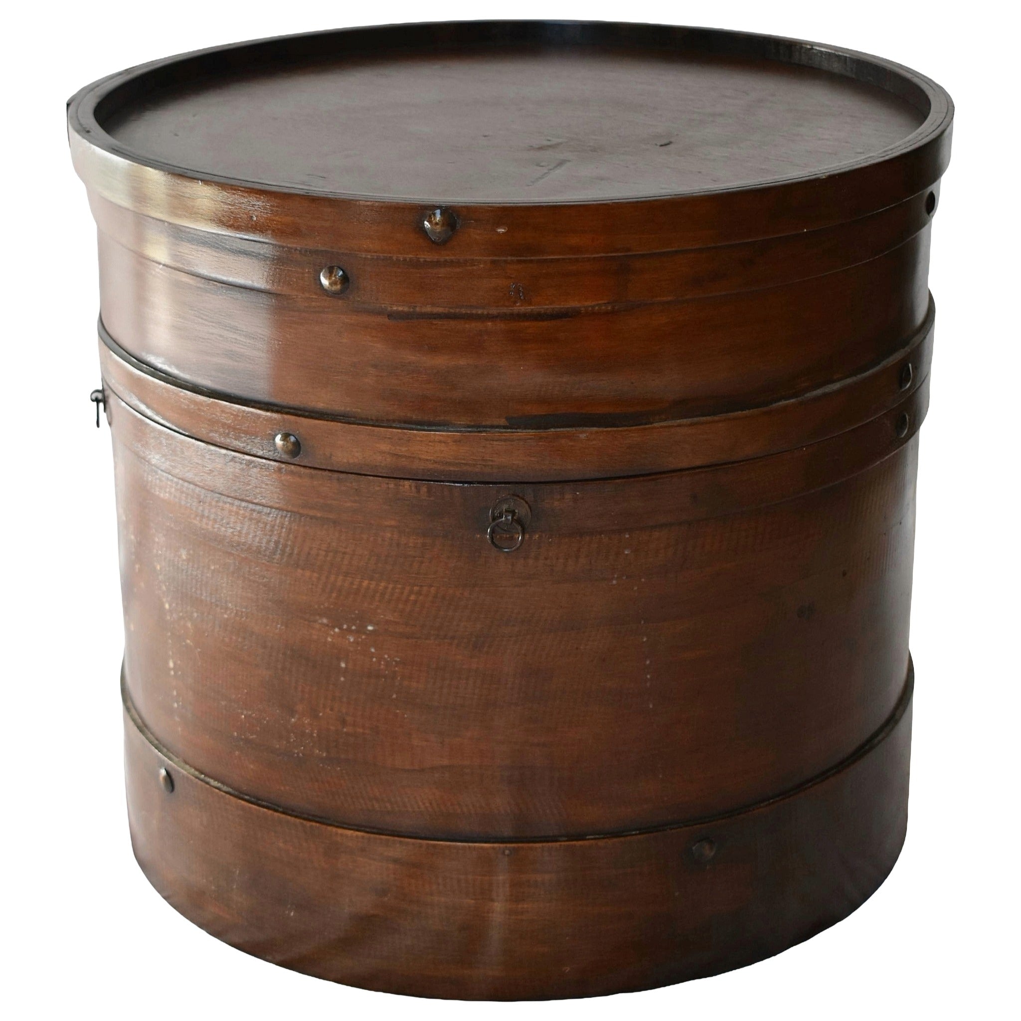 An oval bentwood box with wrought iron rivets and a lift-off cover, showcasing timeless Tibetan craftsmanship. Its aged patina and rustic elegance make it a collectible piece, ideal as a side table or decorative accent.