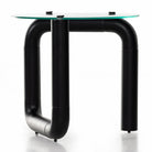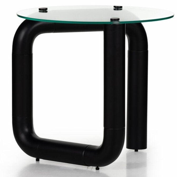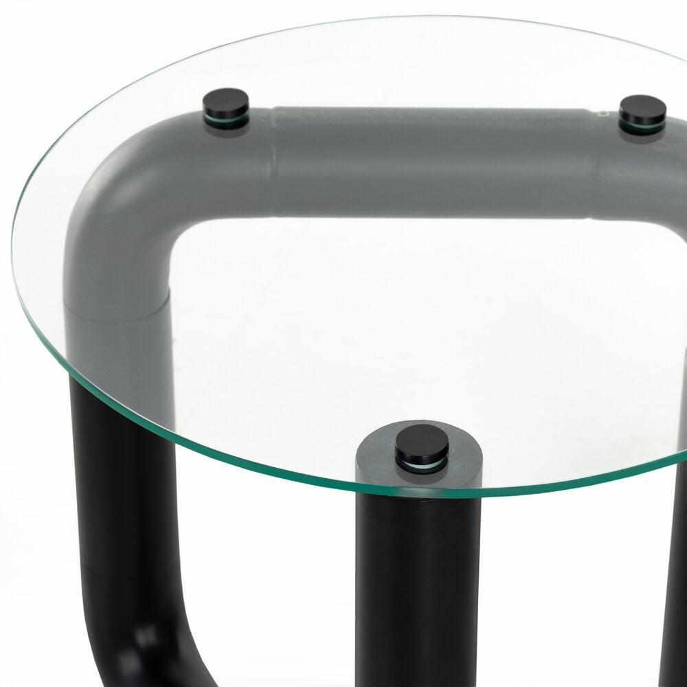 With dramatic volume reflective of Eighties inspiration, black-finished iron forms a unique, continuous-flow base for a rounded tabletop of clear tempered glass.
