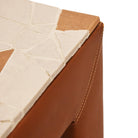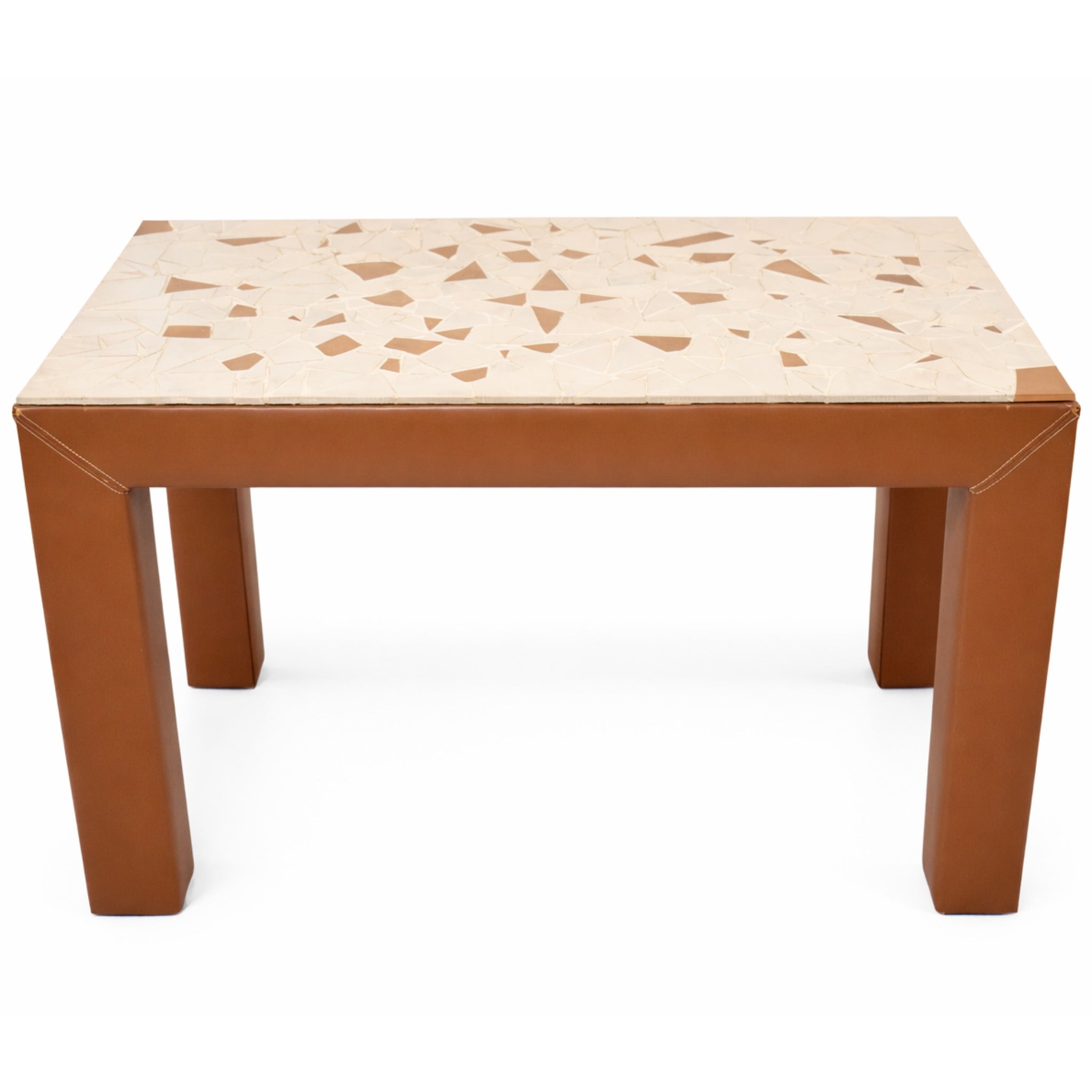 An interplay of materials defines this multipurpose table—mosaic tiles span the surface, supported by leather-wrapped legs that introduce contrast, texture, and material definition.