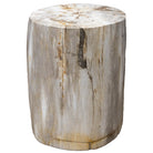 Polished petrified wood stump with raw edge detail and tones of cream to orange with brown grain veining visible on the top.