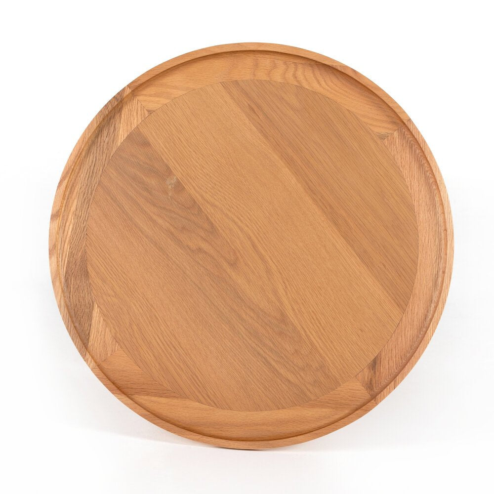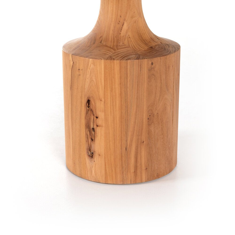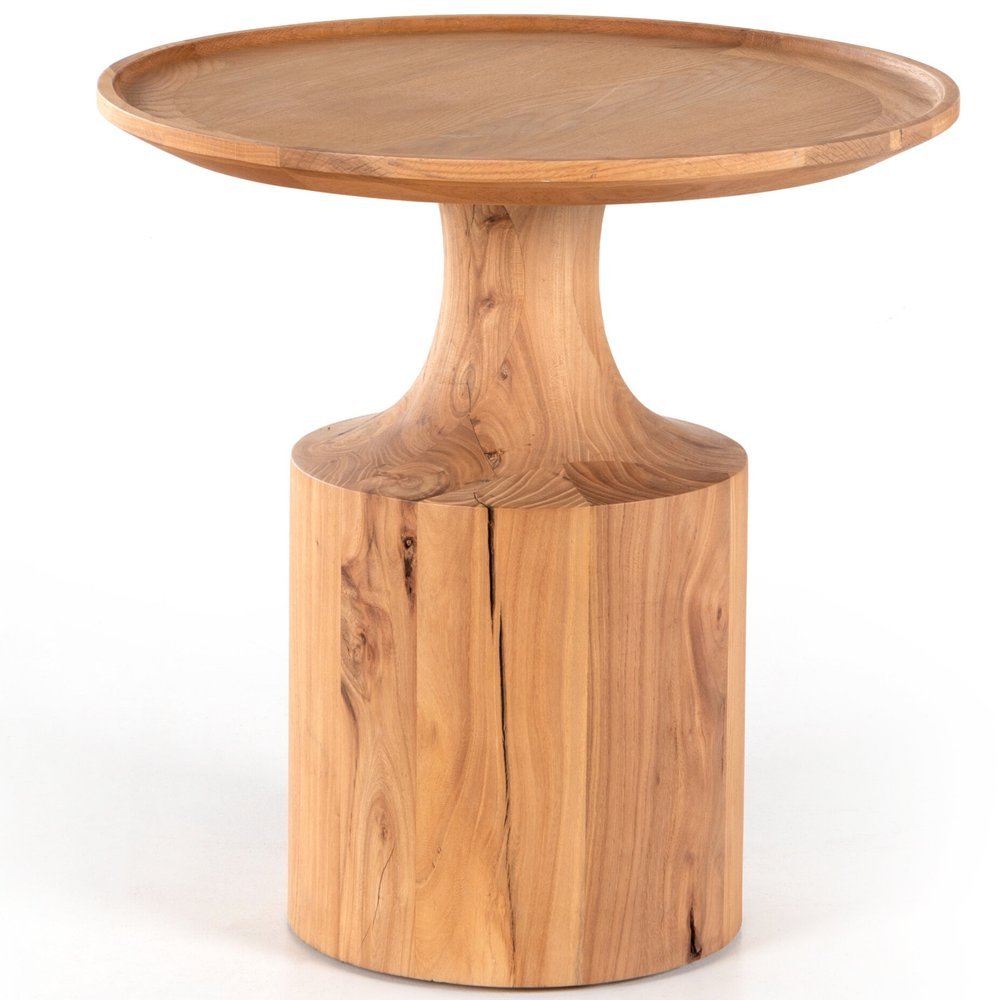Precisely carved from solid reclaimed oak with an oak veneer top, an organic-spirited end table delivers shapely style to any room, with a beautiful range of natural knots and golden hues coursing its entirety.