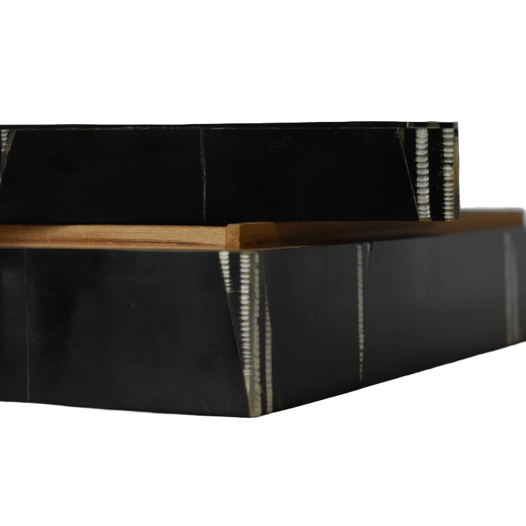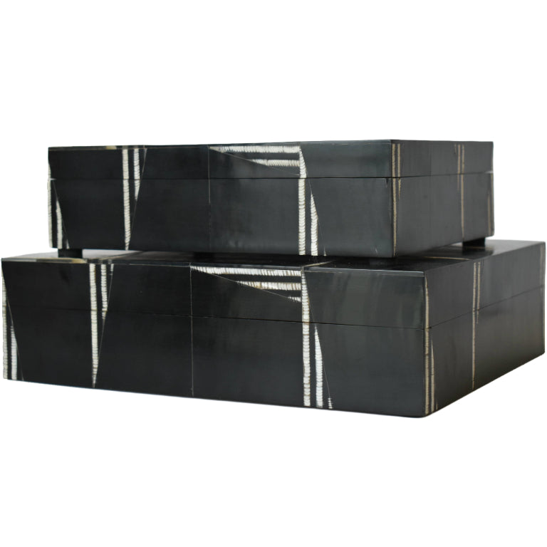 Decorative boxes with a sleek, high-gloss black lacquer finish with subtle, reflective highlights that create a modern, mirror-like effect. Their clean, geometric lines and minimalist design make them both functional and visually striking. A versatile storage piece or accent object — ideal for a coffee table, desk, or vanity.