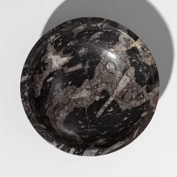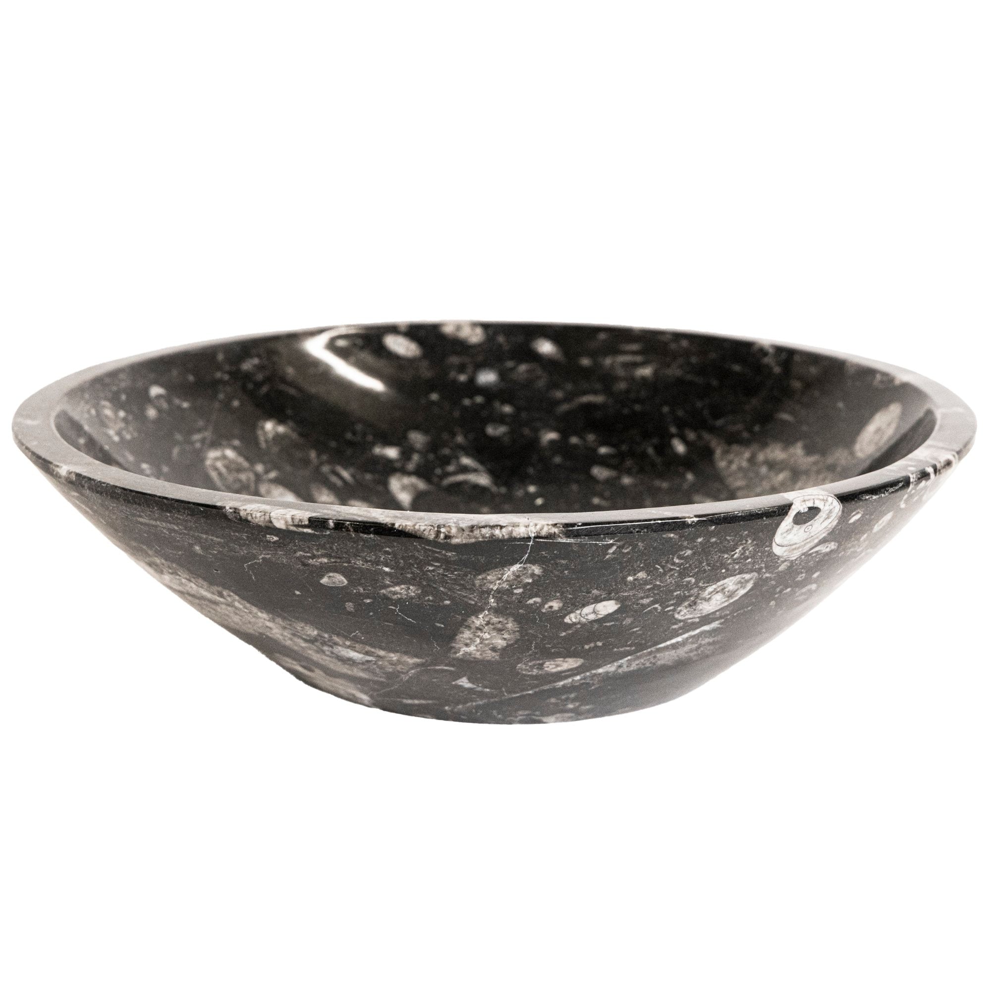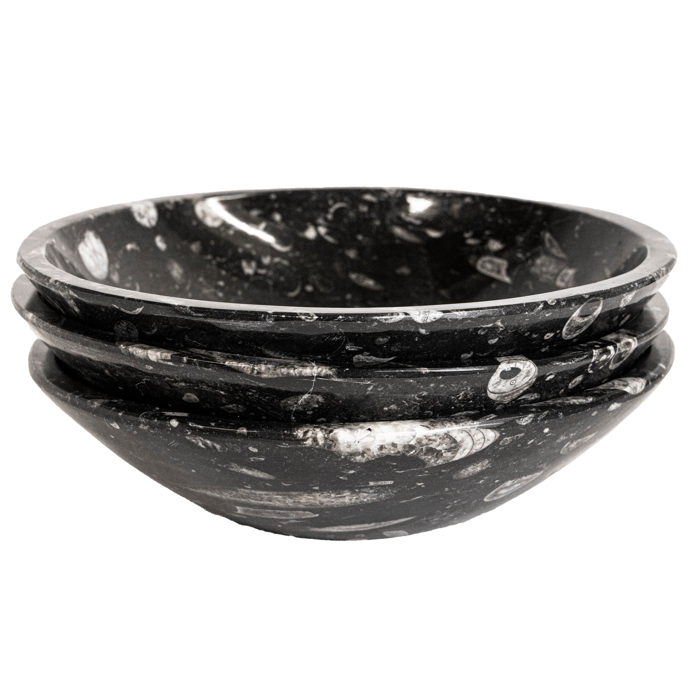 Polished fossilized bowls with natural ammonite fossils. Encased in stone are fossils dating back millions of years, making each bowl one-of-a-kind with slight variations in color.