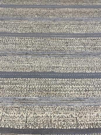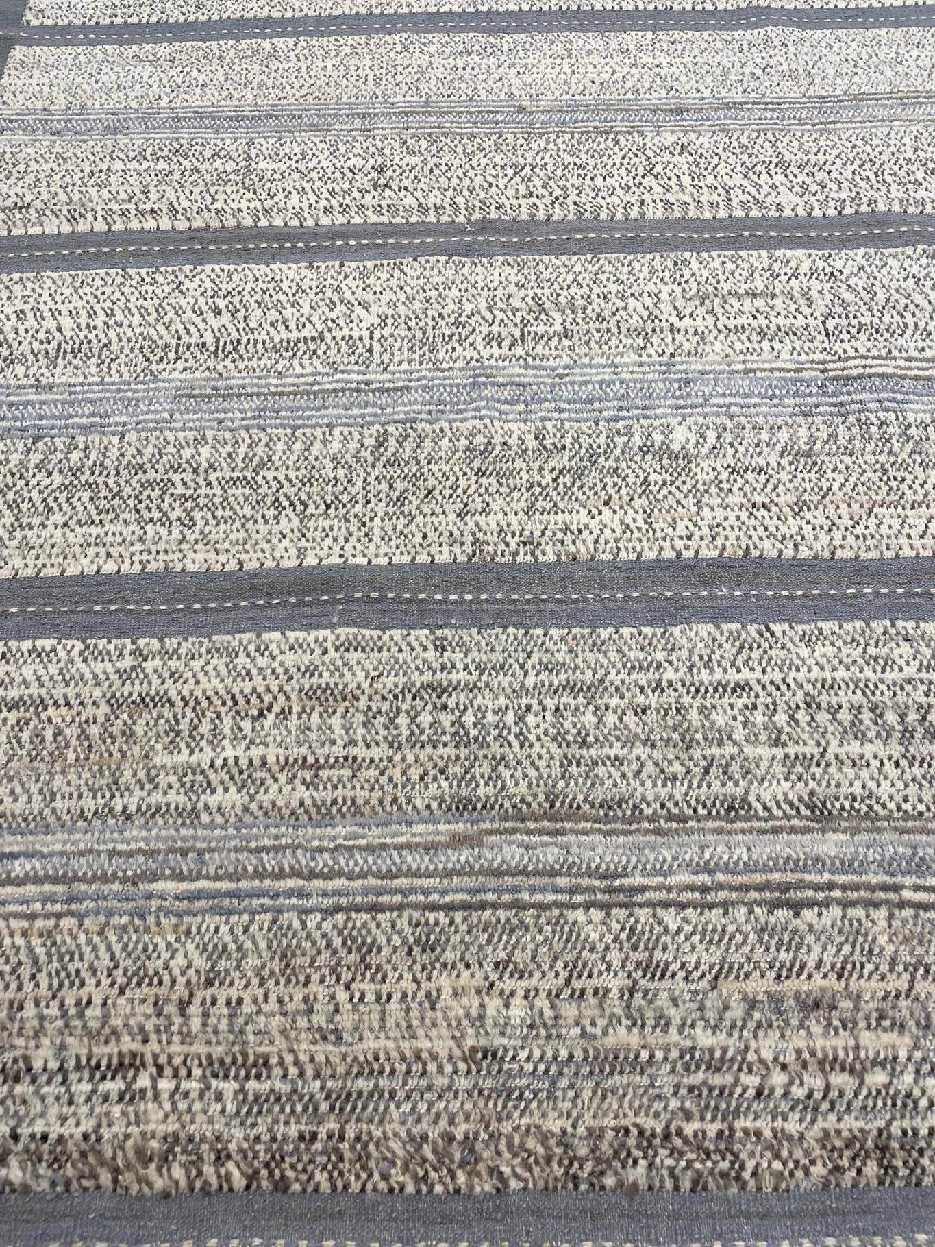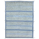 Hand-knotted area rug with a linear variated wool pile and decorative tassels along the length. The delicate textural lines of ivory and shades of faded indigo add depth to this luminous area rug.