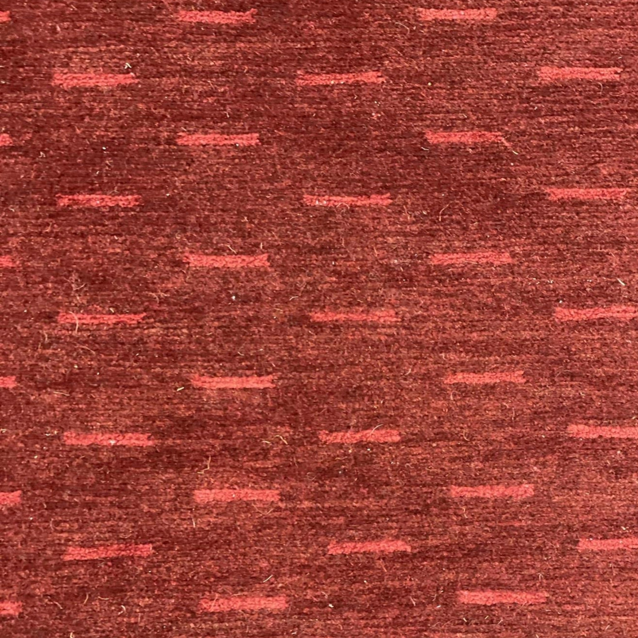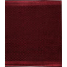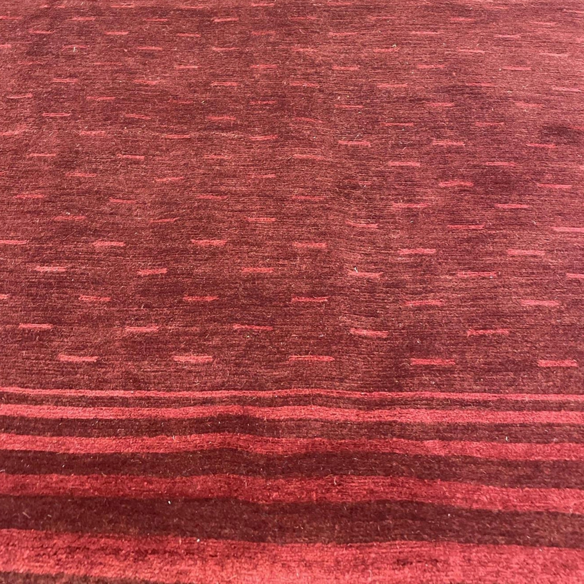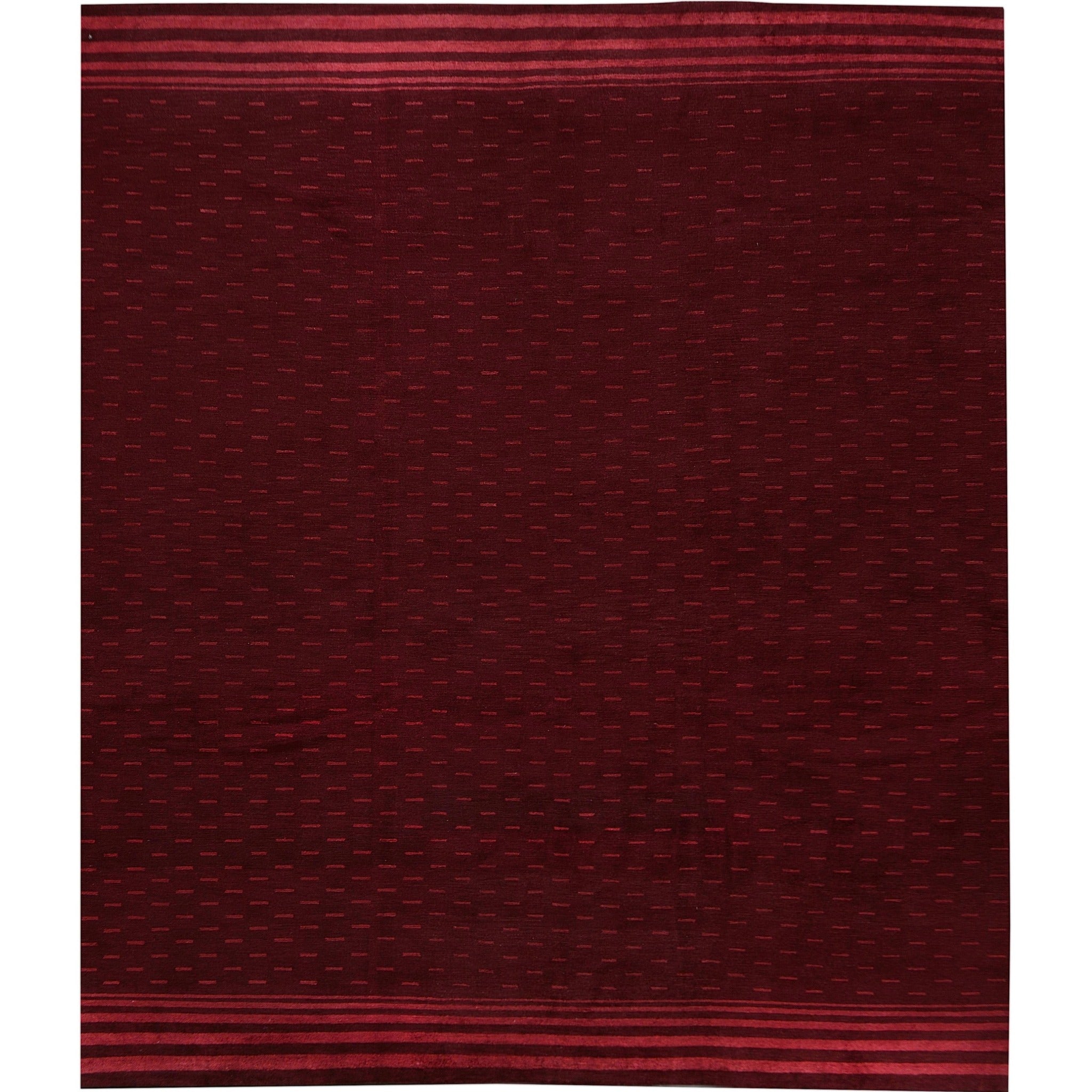 Handwoven in Nepal using a Tibetan weave technique, this area rug is crafted from a refined blend of wool and silk. A saturated field is articulated by fine horizontal detailing and subtle dotted texture, with linear banding at the borders providing structure and definition. The composition balances depth of color with surface variation, emphasizing precision of weave and material contrast.
