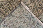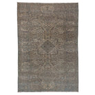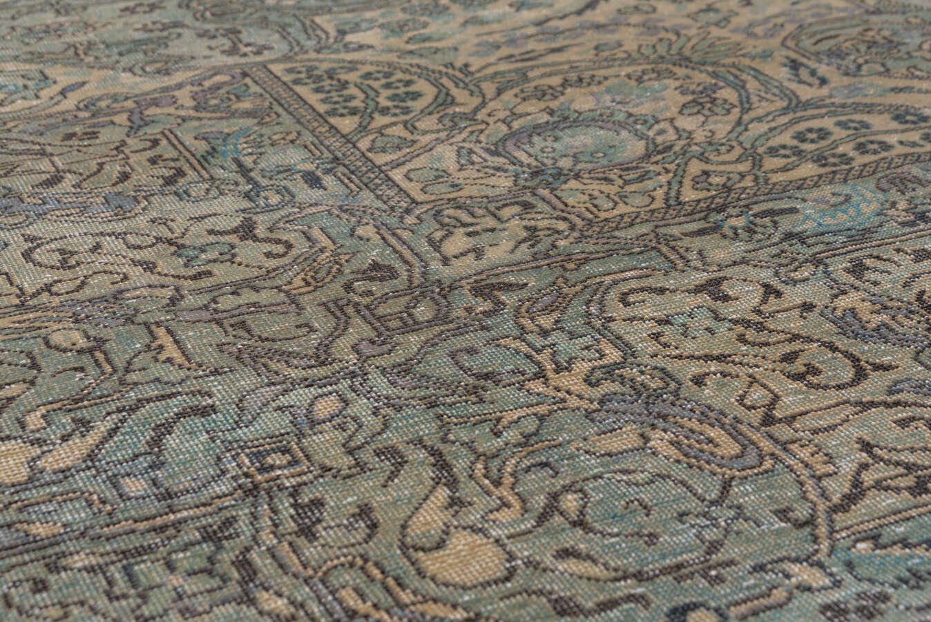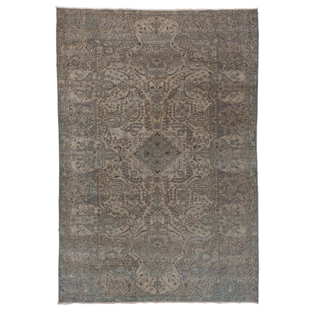 Meticulously hand-knotted in 100% fine wool, this Antique Turkish Kaisary Area Rug circa 1940 features a dramatic classical pattern in a muted color palette. The neutral wheat and gold background hues are accented in a soft blue, and the intricate floral design is outlined in a contrasting espresso tone giving depth and detail to the regal-styled rug.