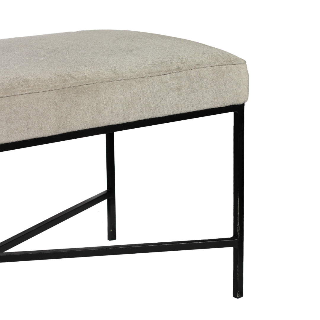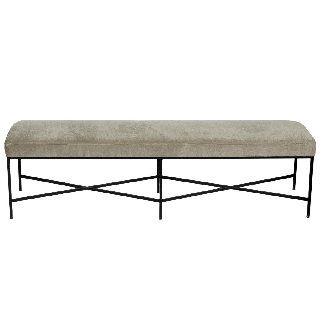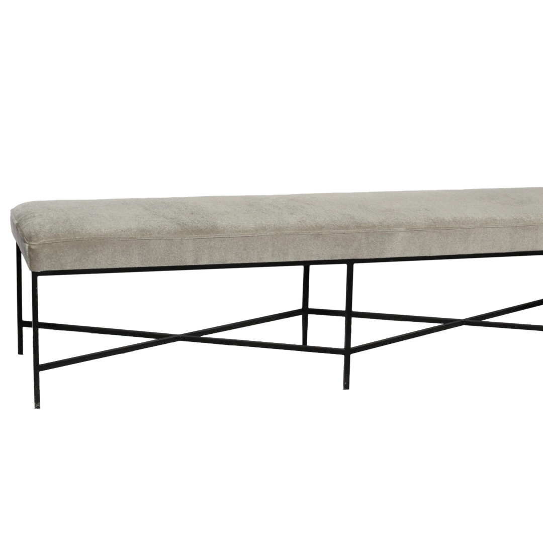 Elegant and durable, this bench features a plush mohair seat atop a sturdy iron frame. Its minimalist design and luxurious texture make it a versatile addition to any space.
