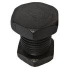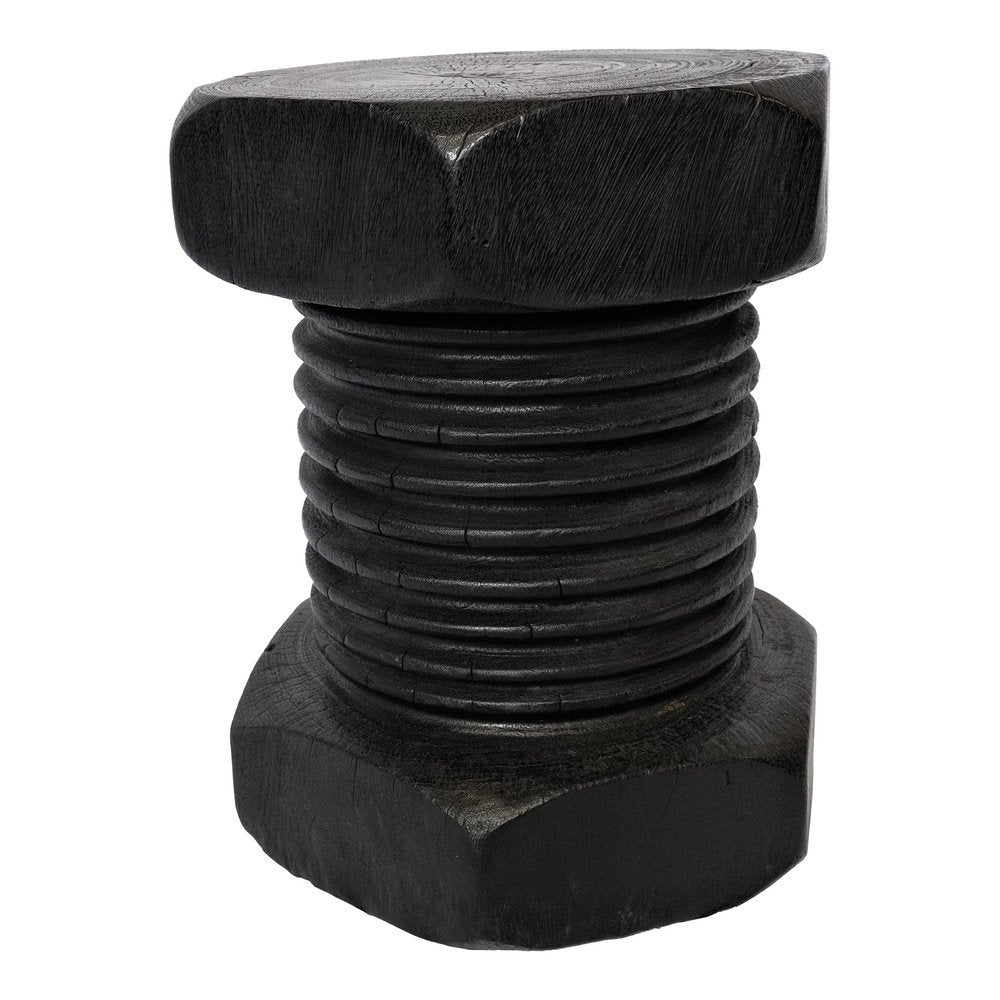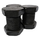 Solid carved wood tables in the shape of nuts and bolts with hexagonal top and base and spindle center.