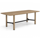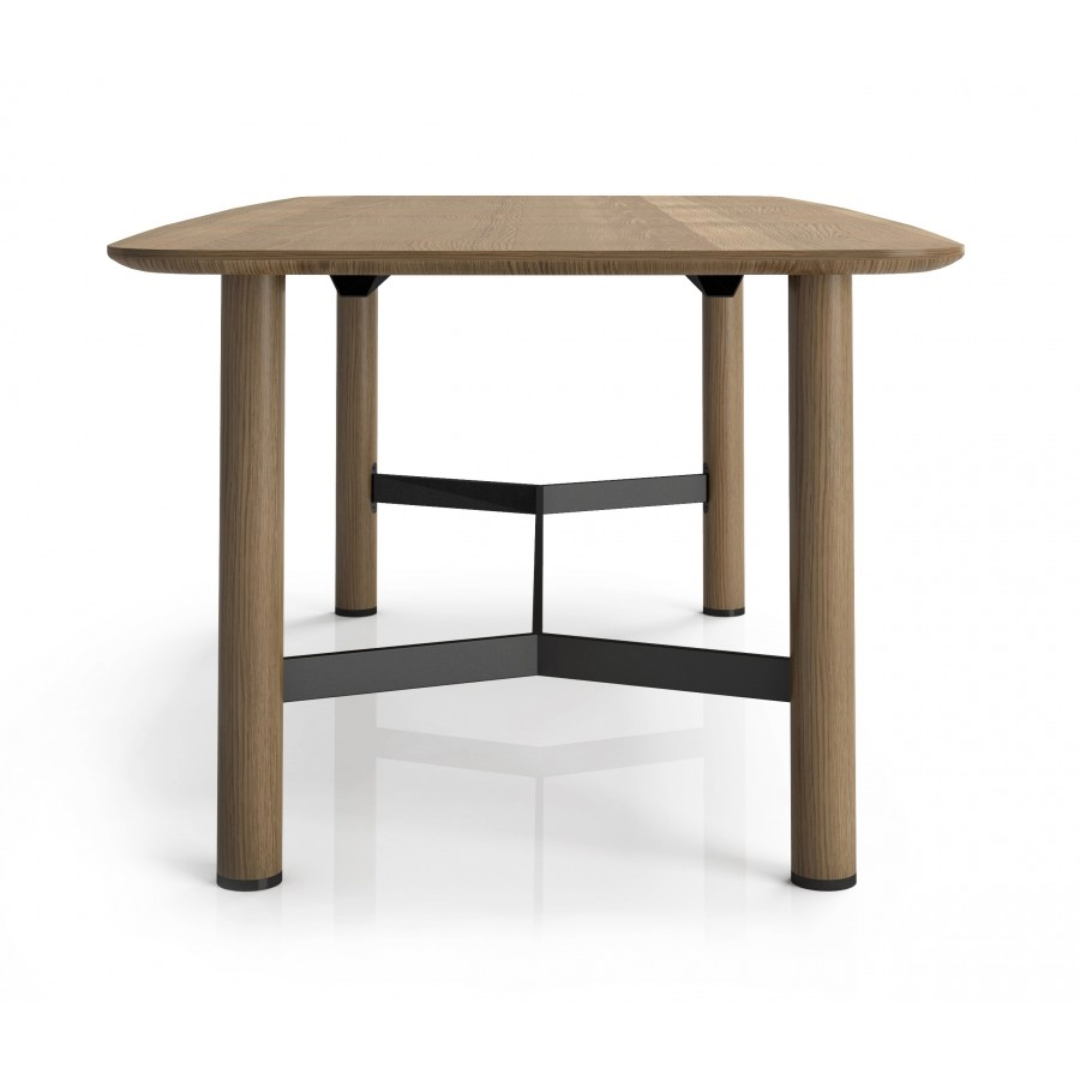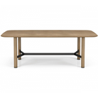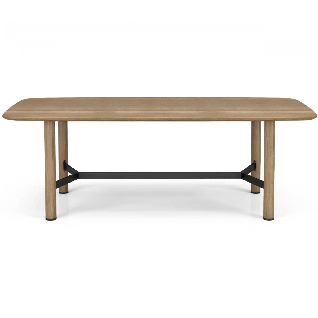 Sleek and durable, this oak table features a softly rounded surface and cylindrical legs reinforced with black metal for stability. Its natural grain finish highlights the wood’s unique beauty, blending warmth with modern design.
