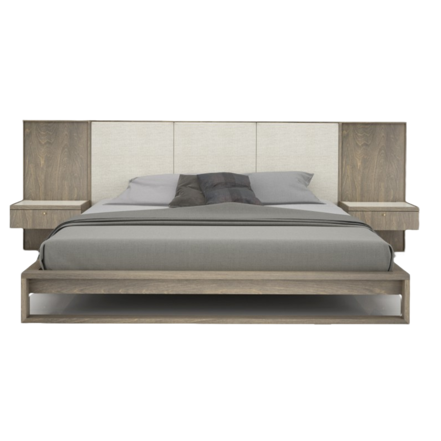The straight lines and sharp angles of the Winslow Bed genuinely reflect the personality of this collection. The headboard comprises upholstered panels or a combination of wood and fabric panels. It supports the wood base — an elegant rectangle supports the base at the other end — and comes with attached bedside tables as stylish as they are functional. Matching freestanding bedside tables are also available for the model without the extended headboard.