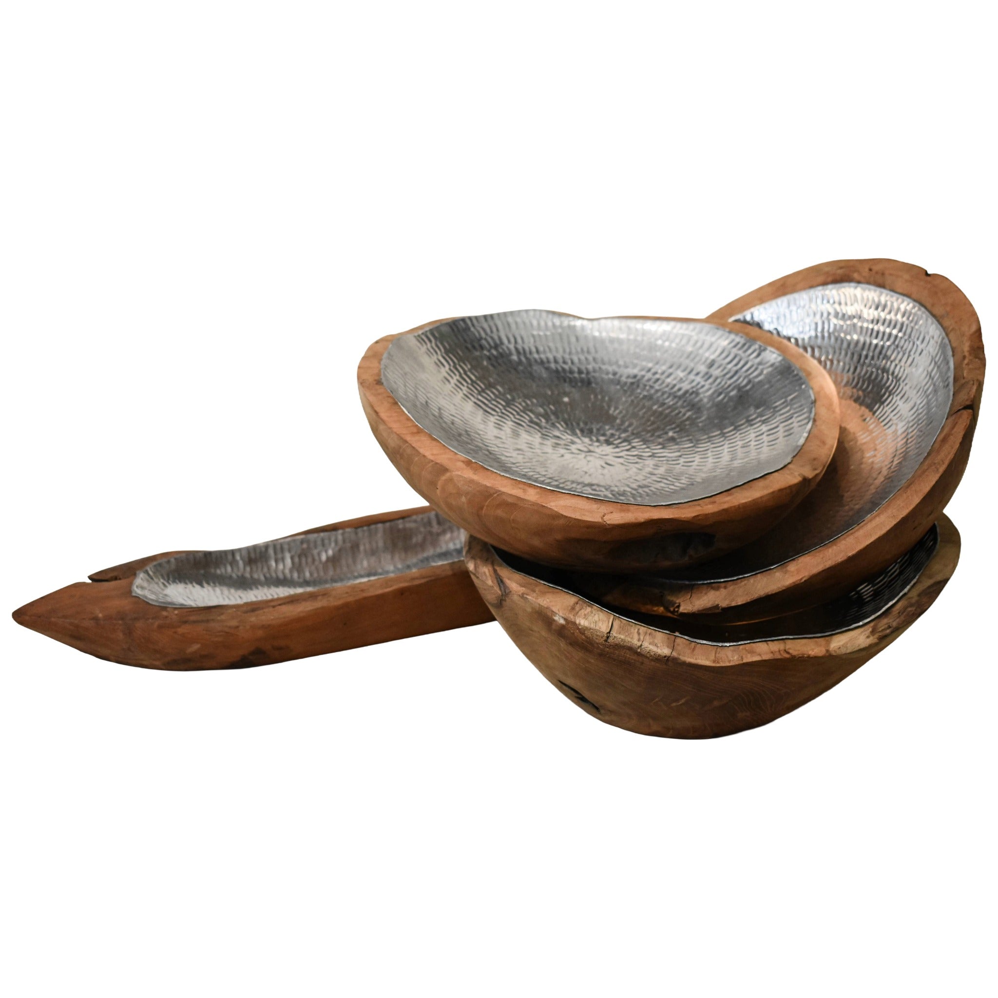 This hand-carved teak wood bowl features sculptural form with a textured metal-lined interior. The contrast between the warm natural wood and the cool metallic finish creates a striking yet understated presence. Ideal as a decorative centerpiece or functional catchall.