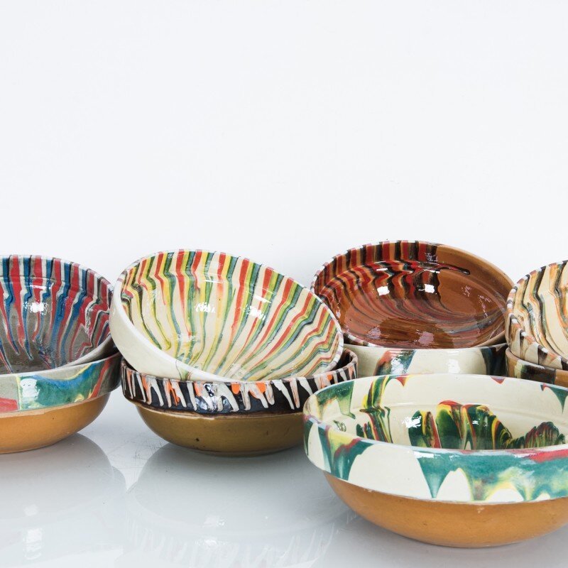 Ceramic bowls with a zig-zag of colored glaze were made initially in Romania.