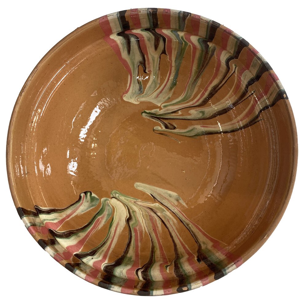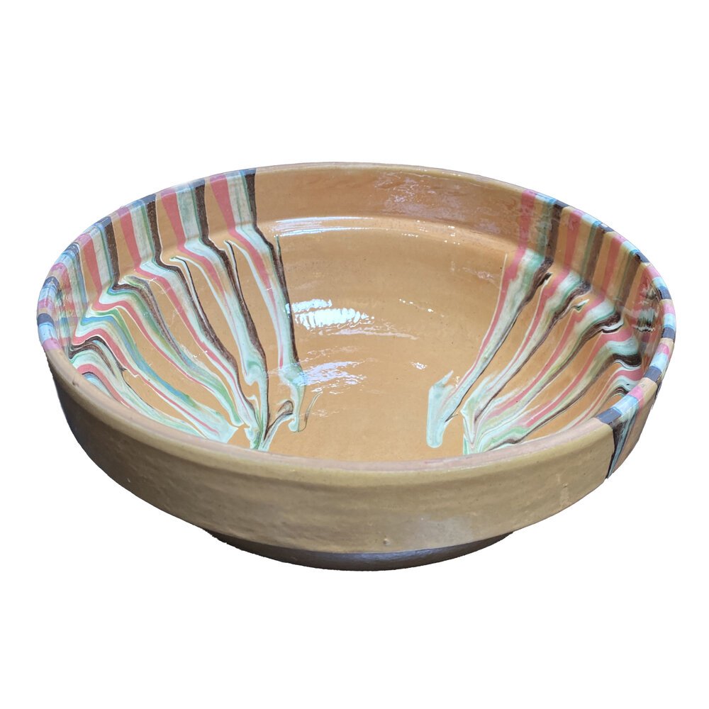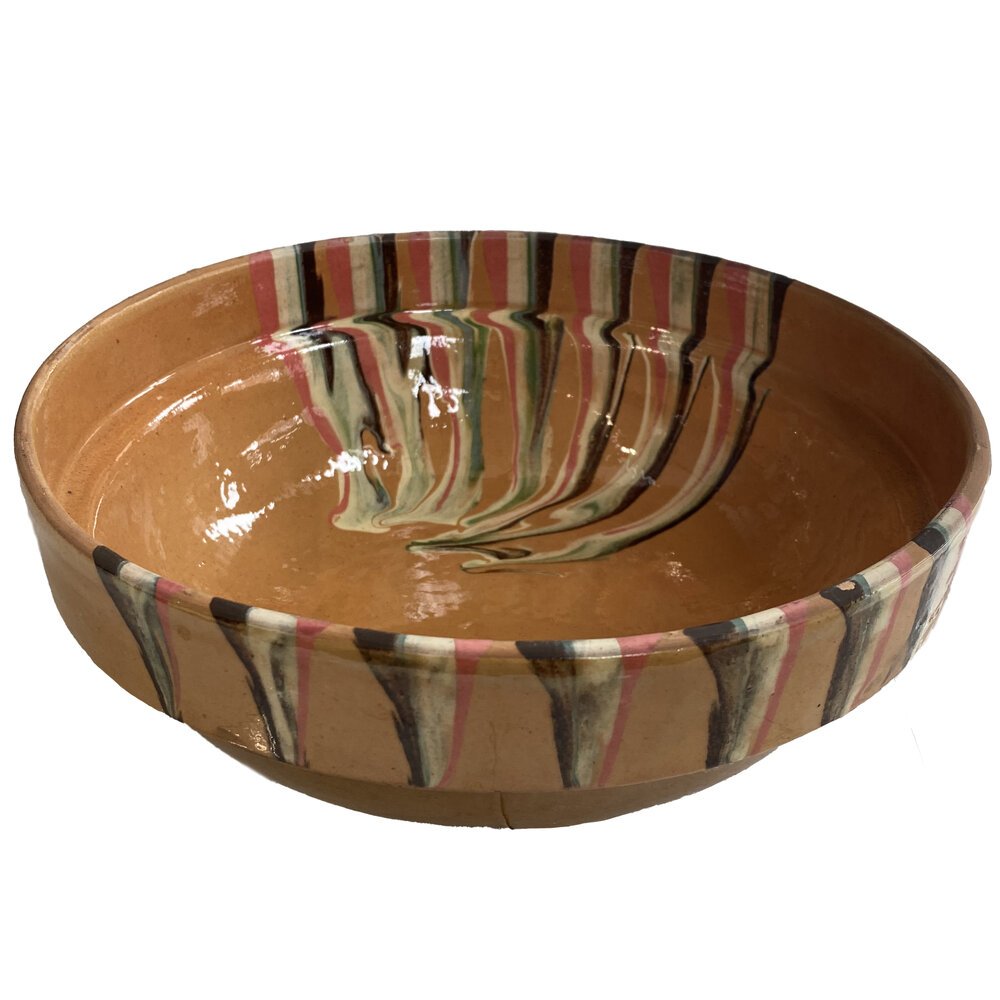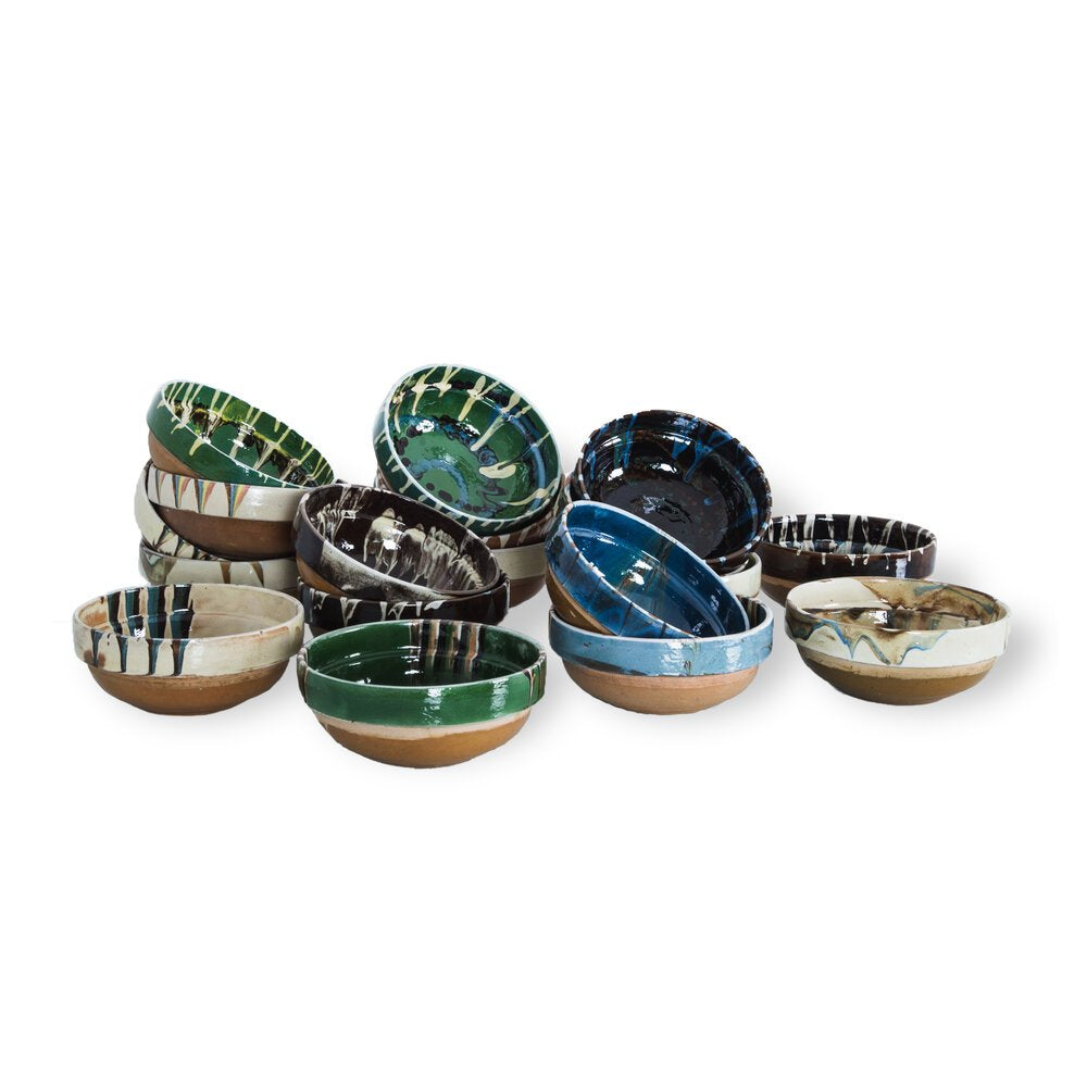 Ceramic bowls with a zig zag of colored glaze originally made in Romania.