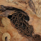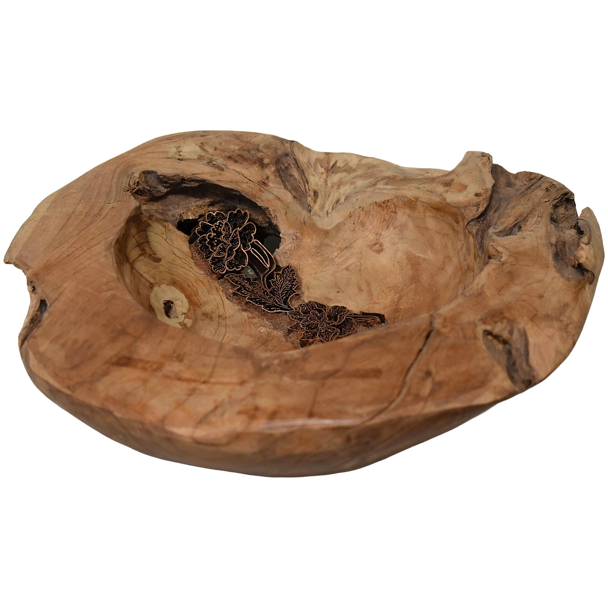 This natural teak wood bowl is hand-carved and accented with a delicate batik floral inlay.