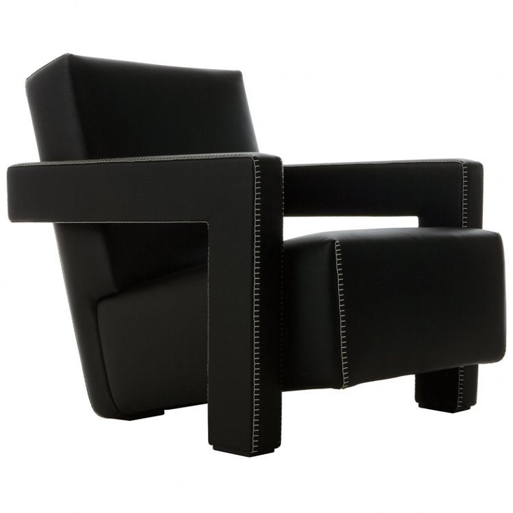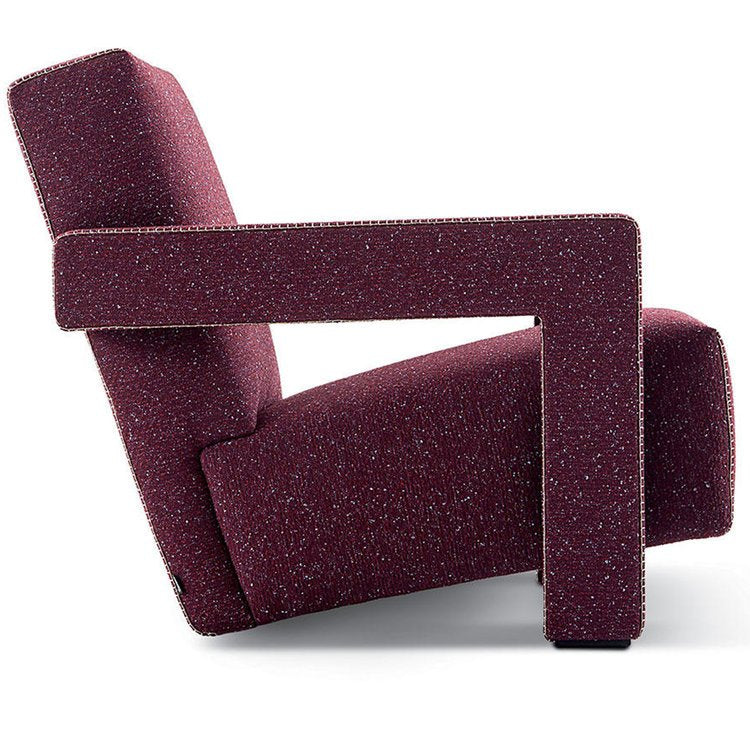 The Utrecht furniture collection created by Gerrit T. Rietveld combines straight geometric shapes with futuristic designs. The armchair is completely upholstered with fabric or leather thus, a coherent overall picture is created. Visible contrast stitching completes this ensemble of line, color, and form.