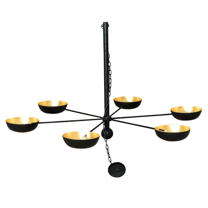 A beautiful, understated, six-armed Gesso Chandelier with Gilded detail inside each cup. The Chandelier produces a lovely, warm light. The design features dozens of small holes in the fascia for each disc, giving a pretty effect when lit. See detailed images for reference.