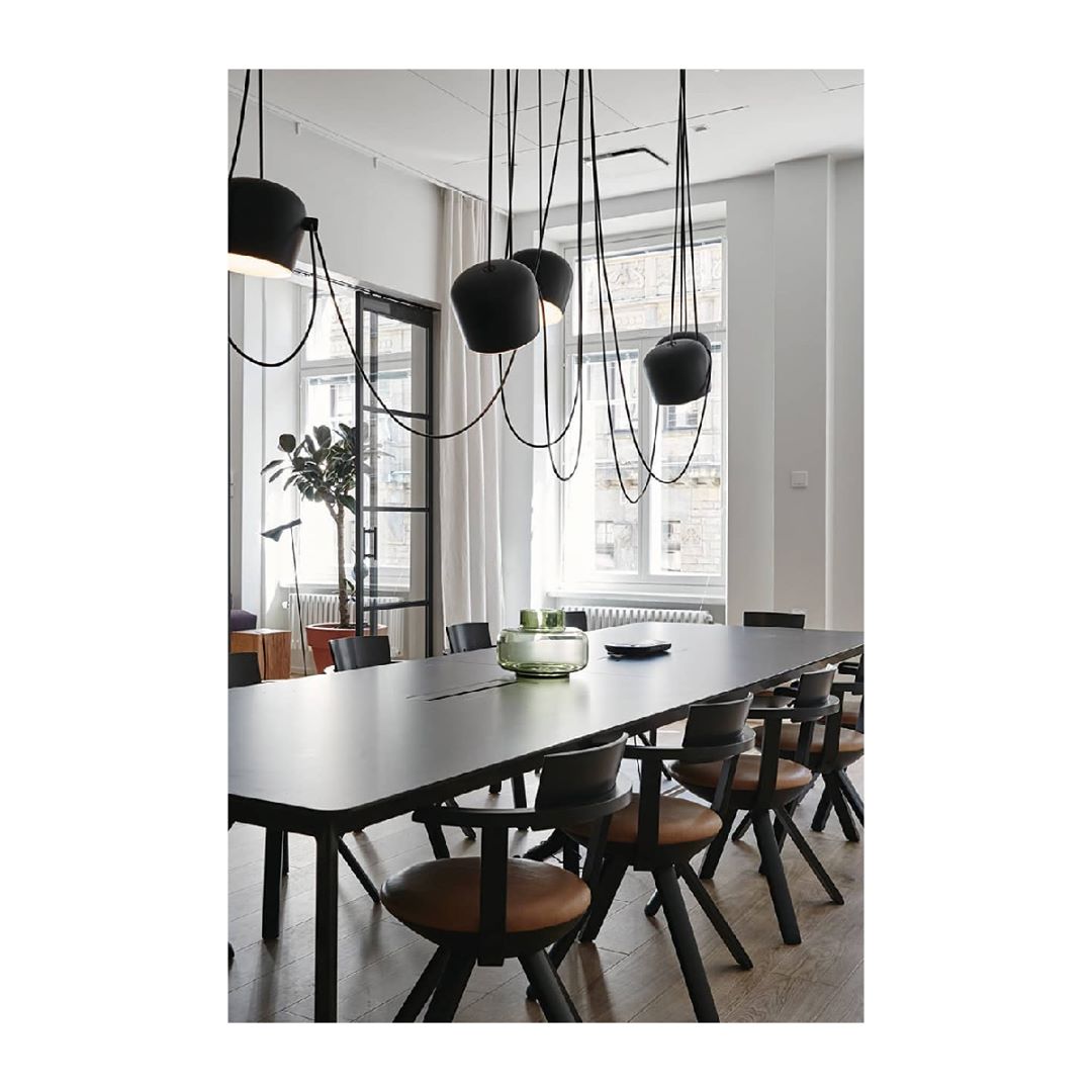 Held in place by generous lengths of wire, the Flos Aim Small LED Pendant is part of a suspension system that can create controlled or chaotic compositions with directional light. The cord attaches to each pendant at two points on the exterior shell, adjusting the aim and distribution of the bright LED light in all directions. With the exception of the fixed orientation installation—providing strict down light—the Aim is an accessible pendant with innate flexibility.