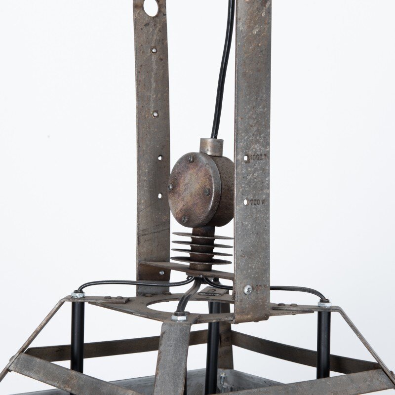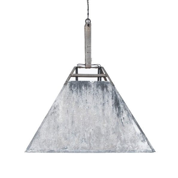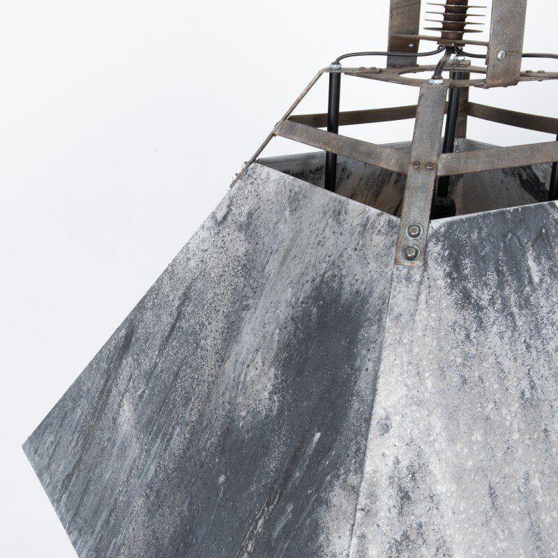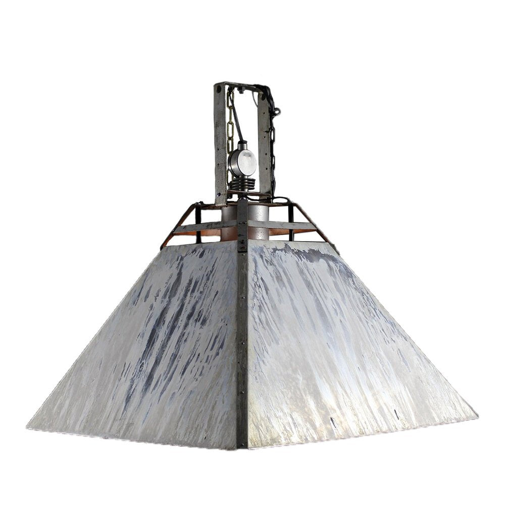 Large European industrial overhead pendant chandelier constructed from zinc with exposed fixture and chain circa the 1970s.