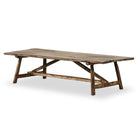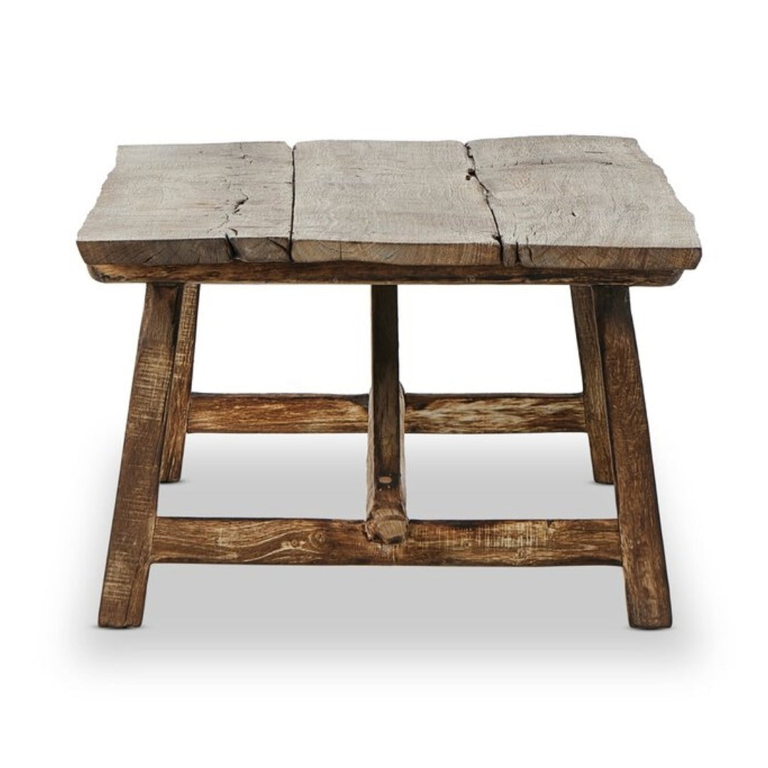 A character-rich coffee table of burnt bleached oak pairs and a trellis base with a wide, planked top. A beautifully aged finish reflects the artisanship behind this unique Wabi Sabi-inspired piece, while natural cracks and heavy graining speak to the organic sourcing of materials.