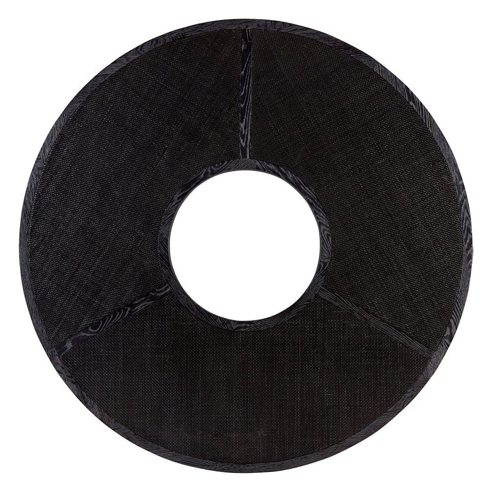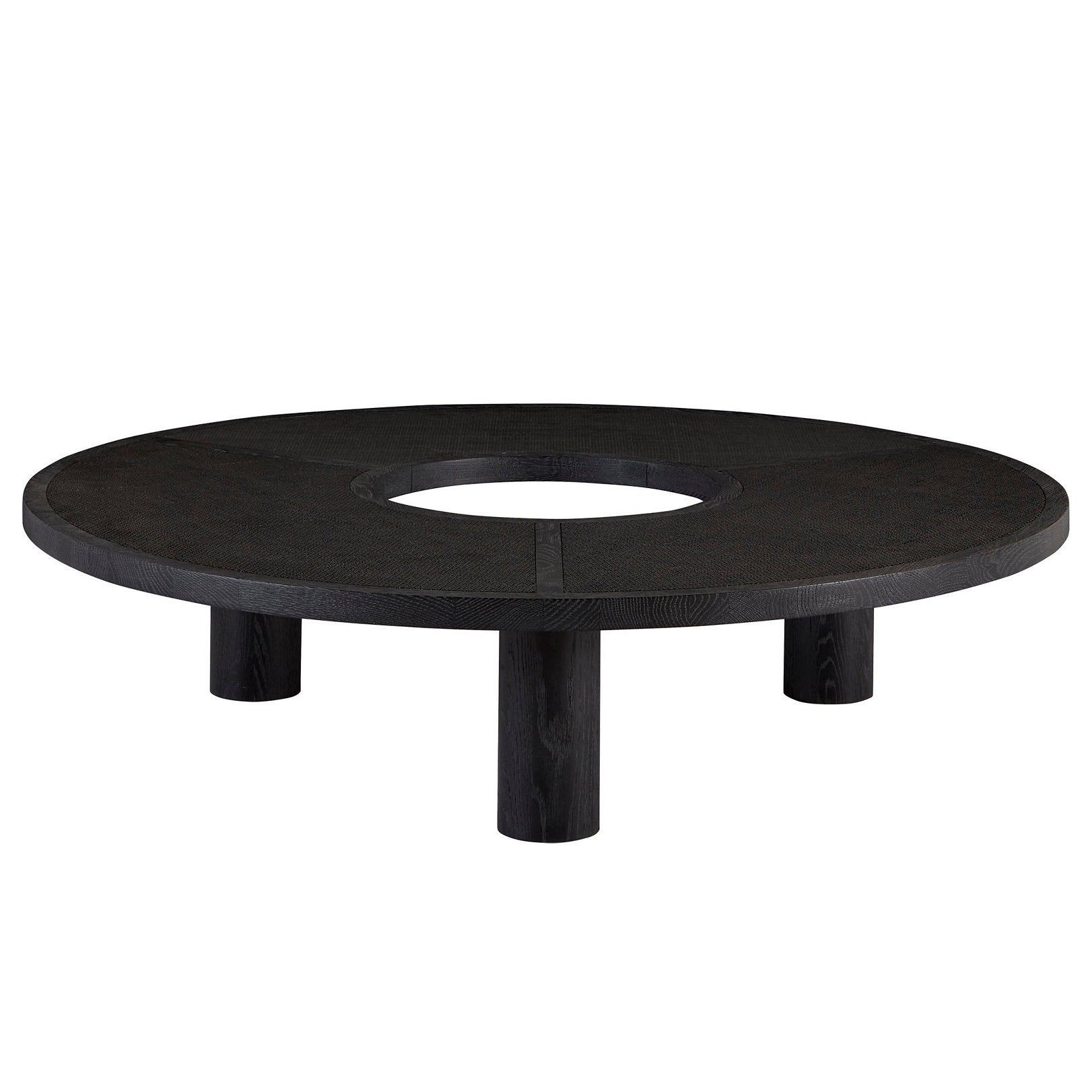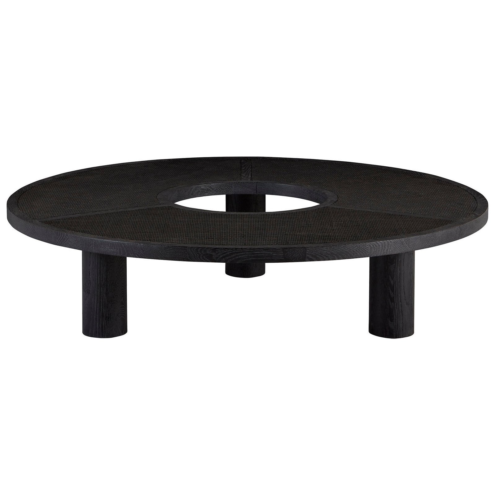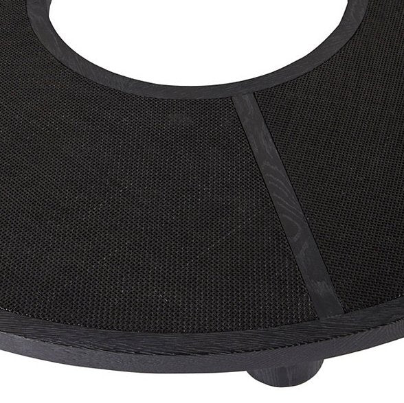 Round oak cocktail table with inset mesh caned panels. The negative space in the center provides a unique silhouette supported by thick cylinder posts.