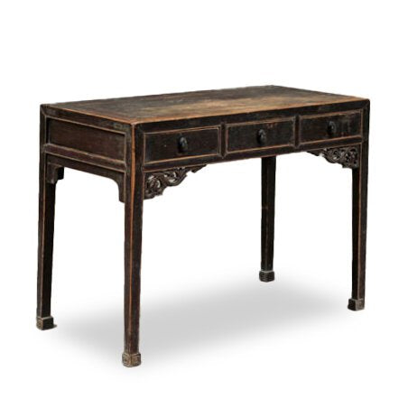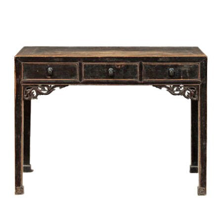Elegant antique table desk in black finish with delicate filigree corner accents.