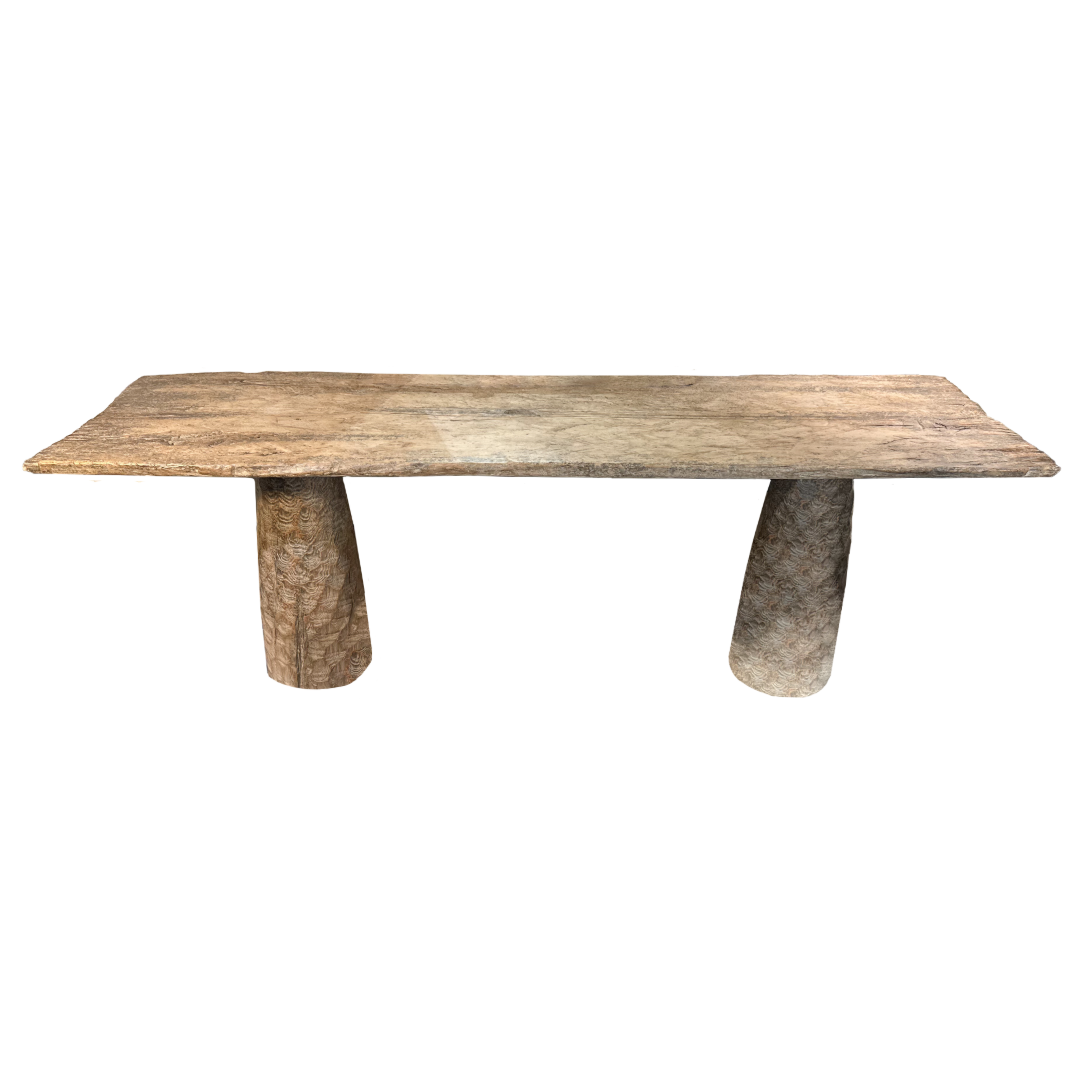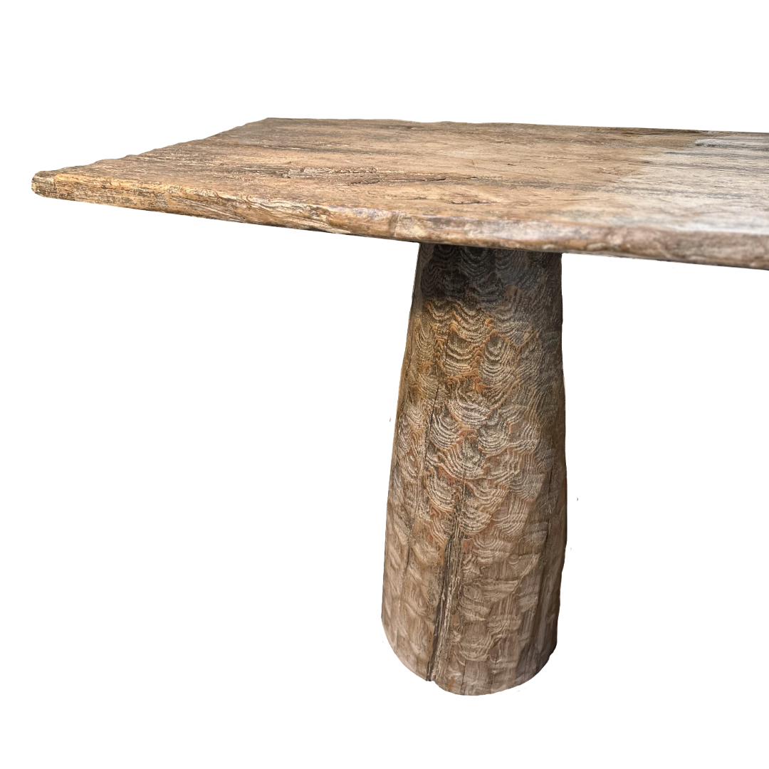 This antique Chinese wood console features thick, sturdy legs and exquisite hand-carved details, and this piece combines artistry and functionality. A bold addition to any room, showcasing timeless craftsmanship.