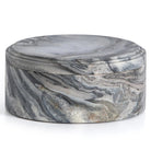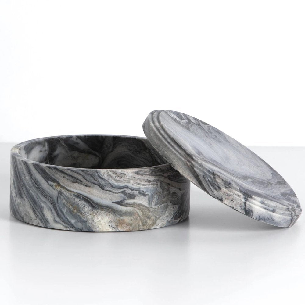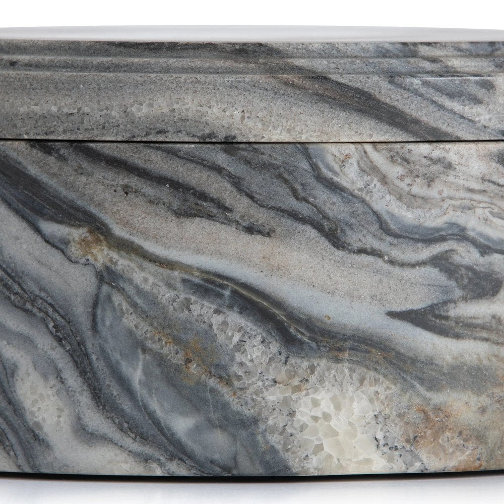 Out-of-sight storage. Made from black marble with beautifully fluid veining, a rounded lid removes to reveal space for jewelry, keepsakes, and more. Each piece is unique.