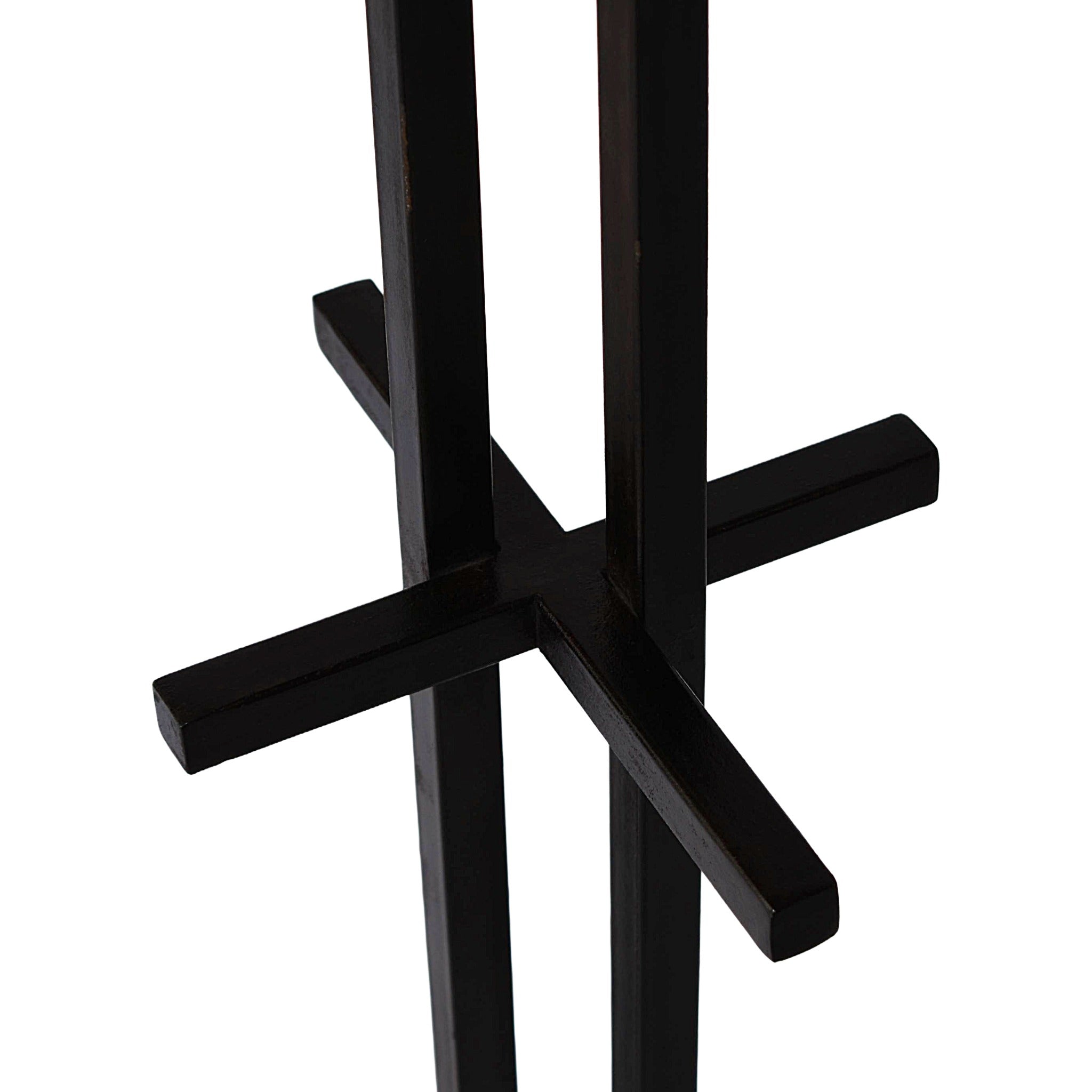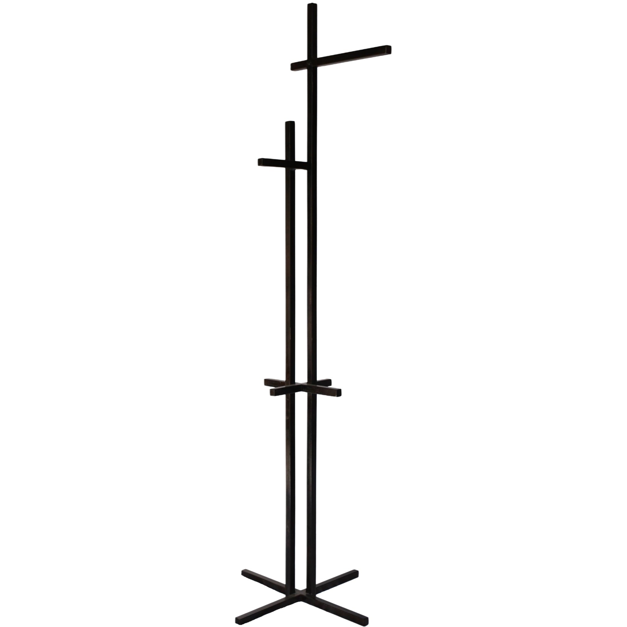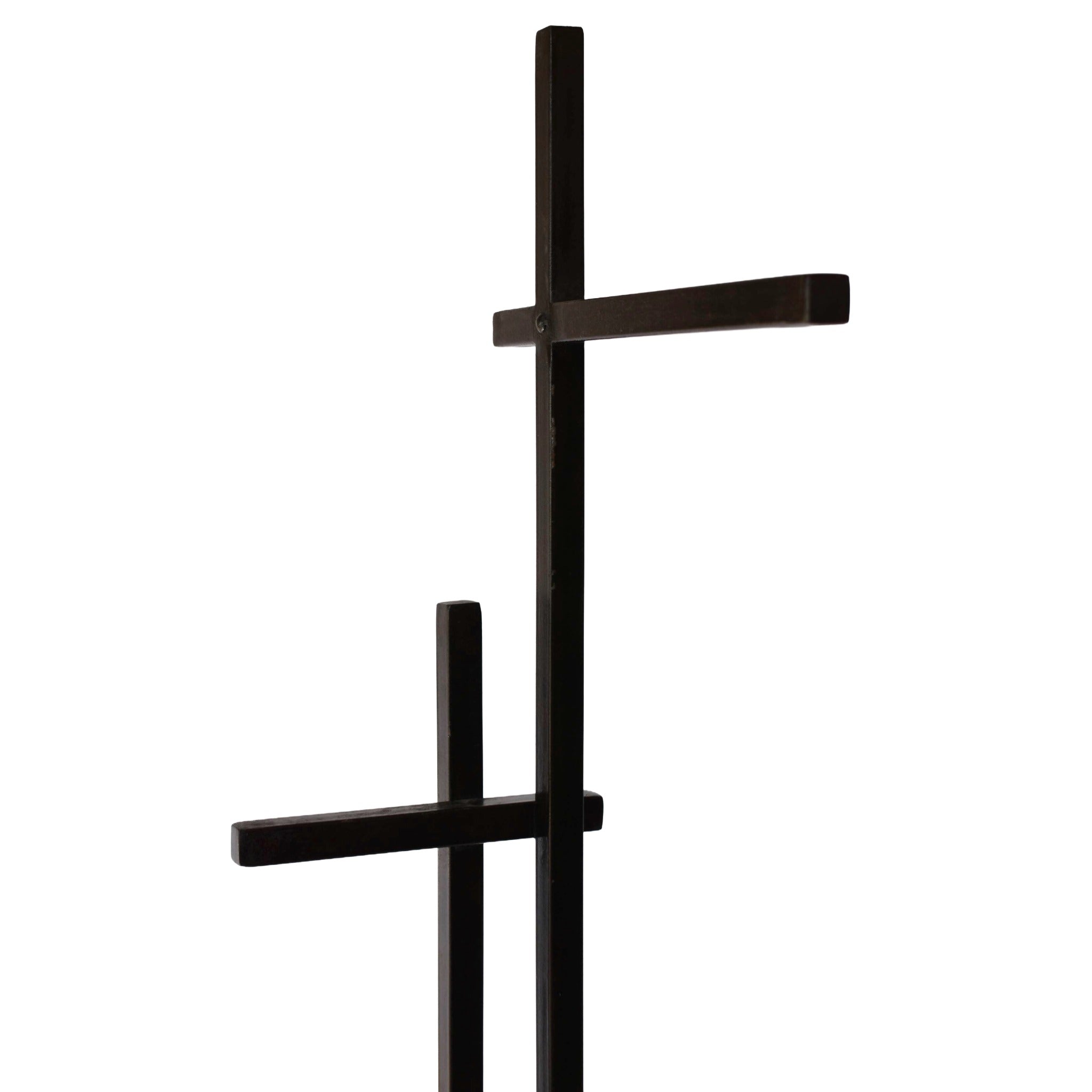 Metal linear coat rack that doubles as a functional piece of art. Its unique construction features joints at different angles, allowing the stand to change its appearance depending on the viewing angle. Sleek and space-saving, it brings both style and function to your home