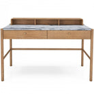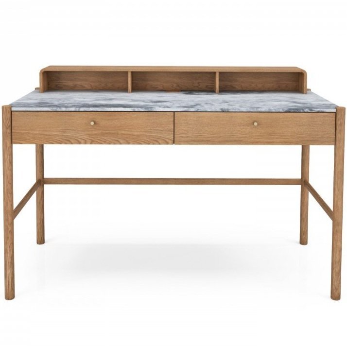 The Jasper writing desk features a slim streamlined profile with thin cylindrical legs and a granite top. The desk includes a small hutch-style shelf for storage.