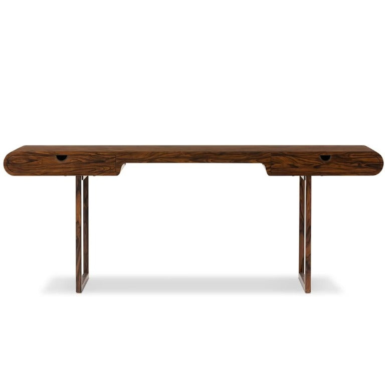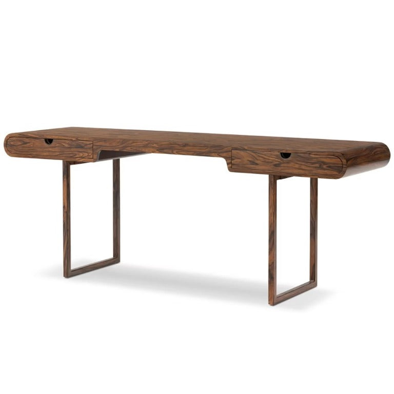 This desk features morado veneer laminated to a metal base. A rare, artisan technique that results in a super-slim profile. Rich graining delivers natural character, while rounded edges reflect Brazilian mid-century inspiration.