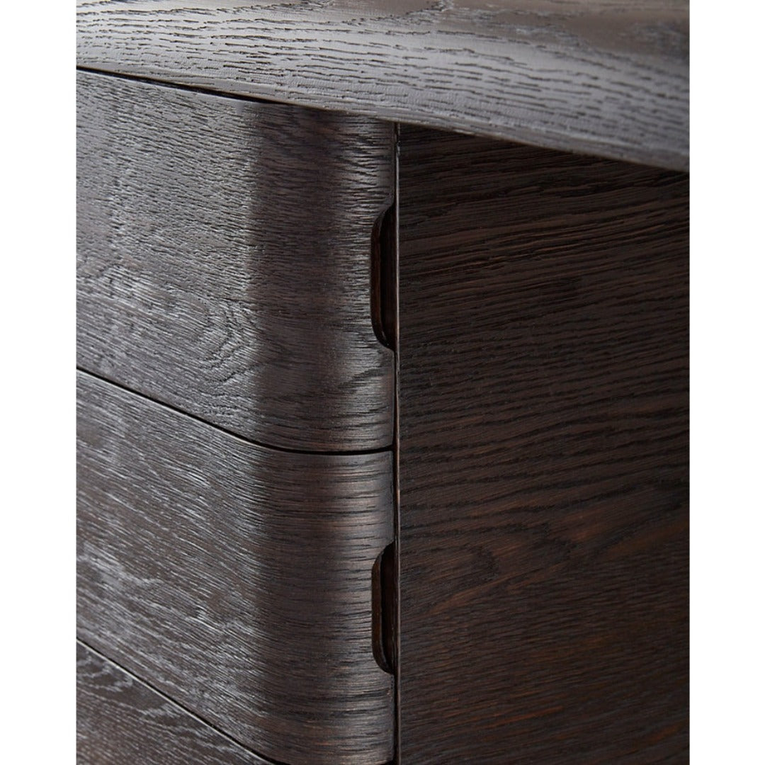 Crafted from sandblasted oak, the Mott St Desk embodies a raw and refined aesthetic. Its sculptural design features organic rounded edges, angled inset legs, and a column of four drawers for practicality. The curved drawers feature integral handles that add to the modern sophistication of this design.