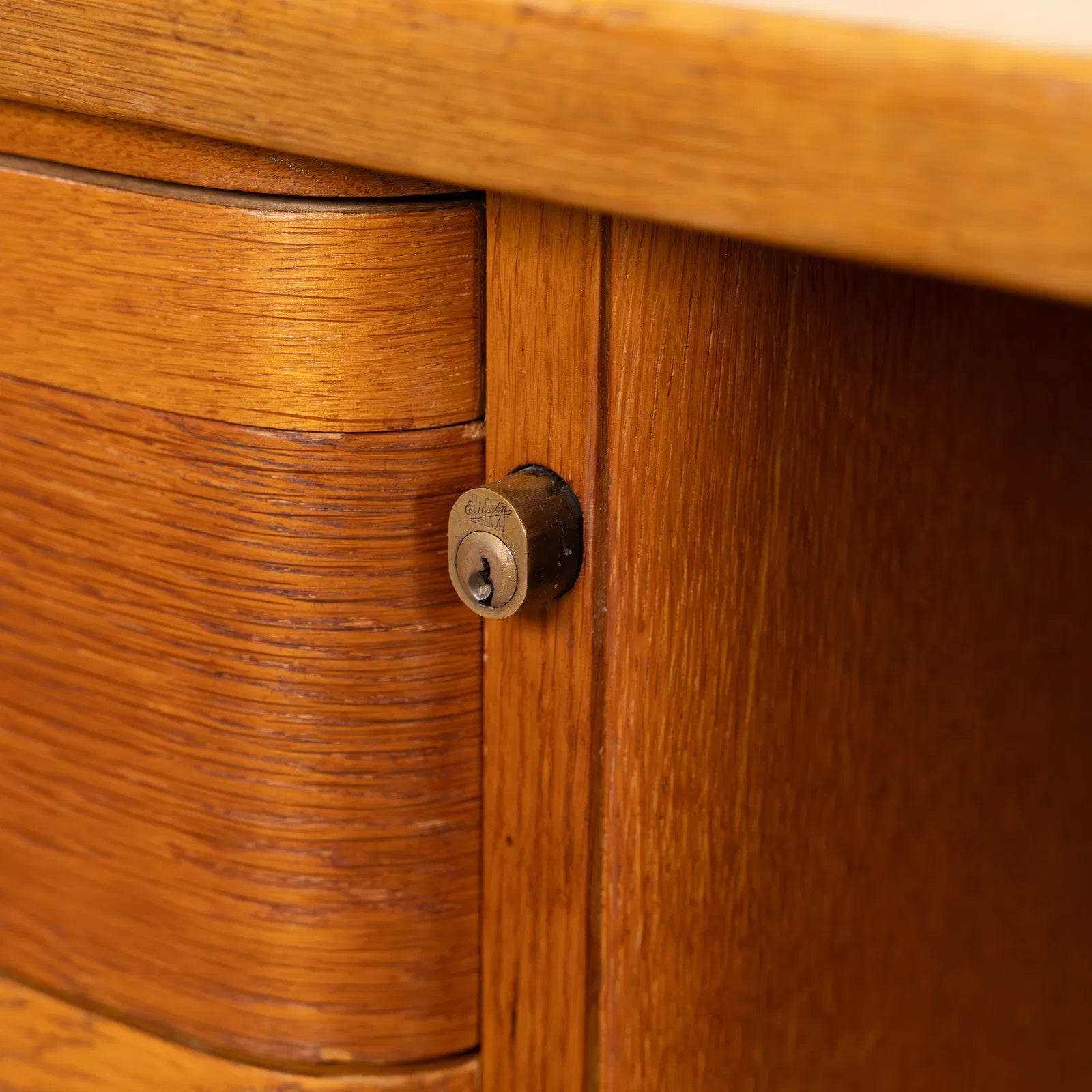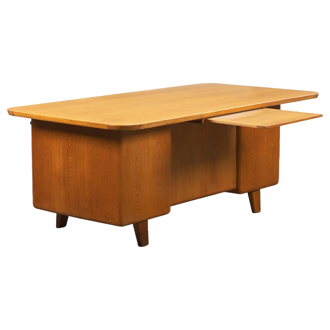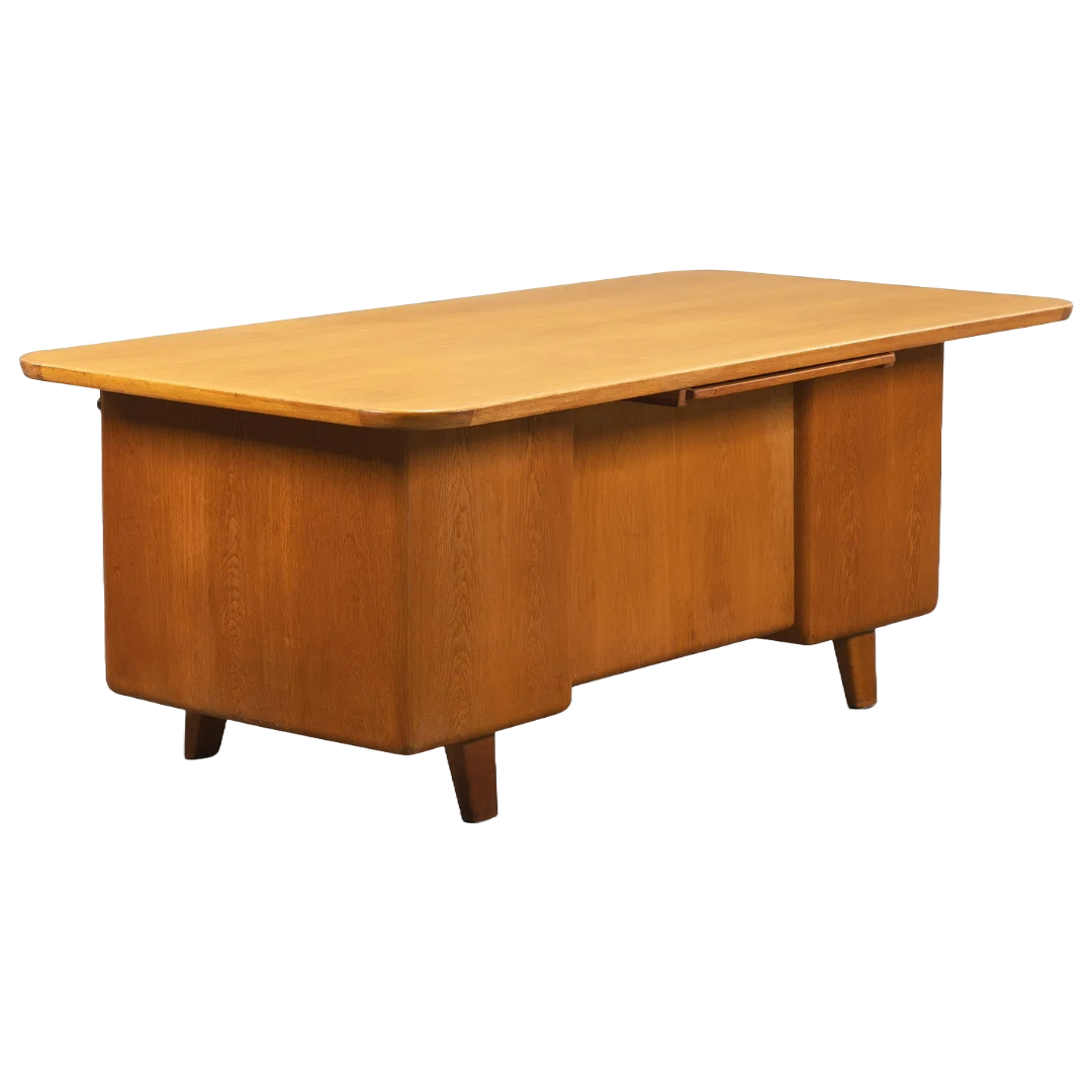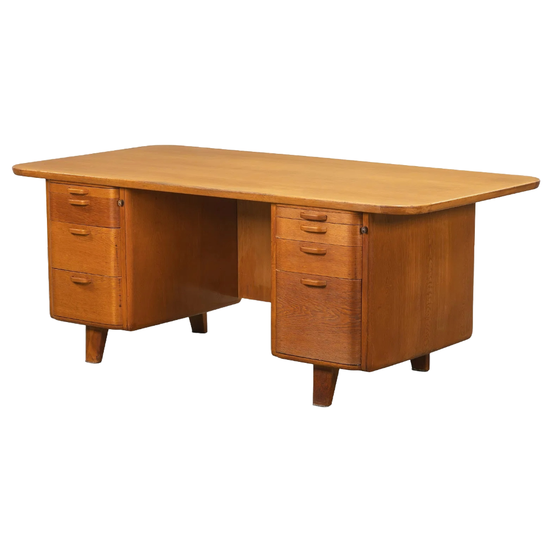 A sculptural bentwood executive desk designed by Gunnar Ericsson, showcasing clean Scandinavian lines and balanced proportions. With drawer banks on each side and a wide, gently curved top, it offers both generous workspace and thoughtful storage.