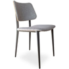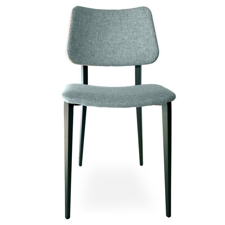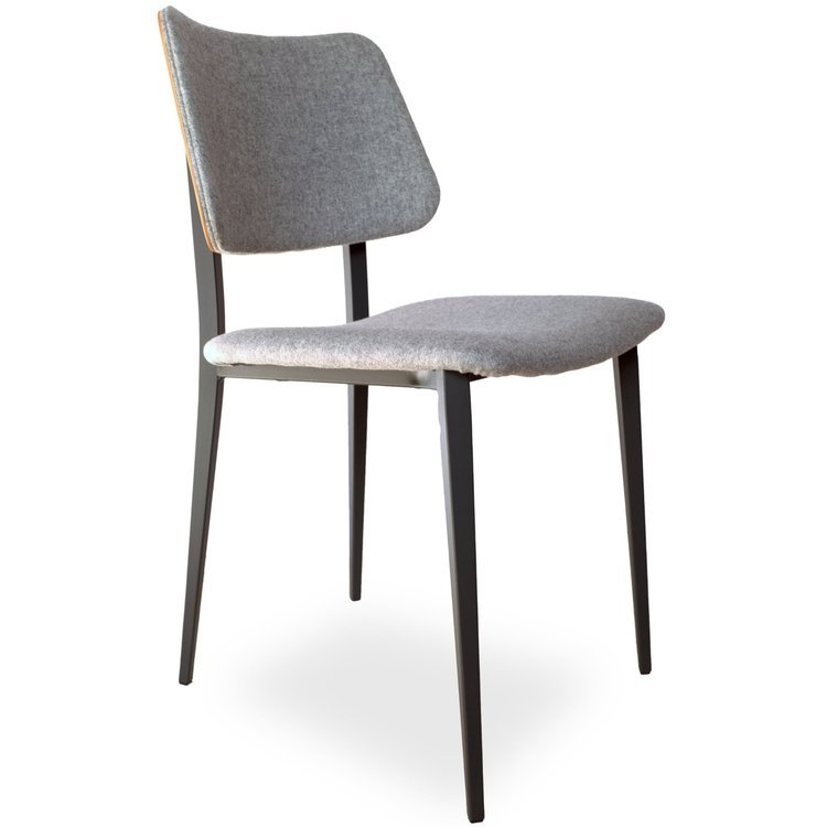 Sleek modern, and simplistic. The Leon dining chair features thin tapered legs, an upholstered seat and back, and exposed wood on the backrest.
