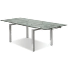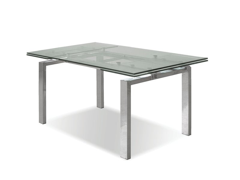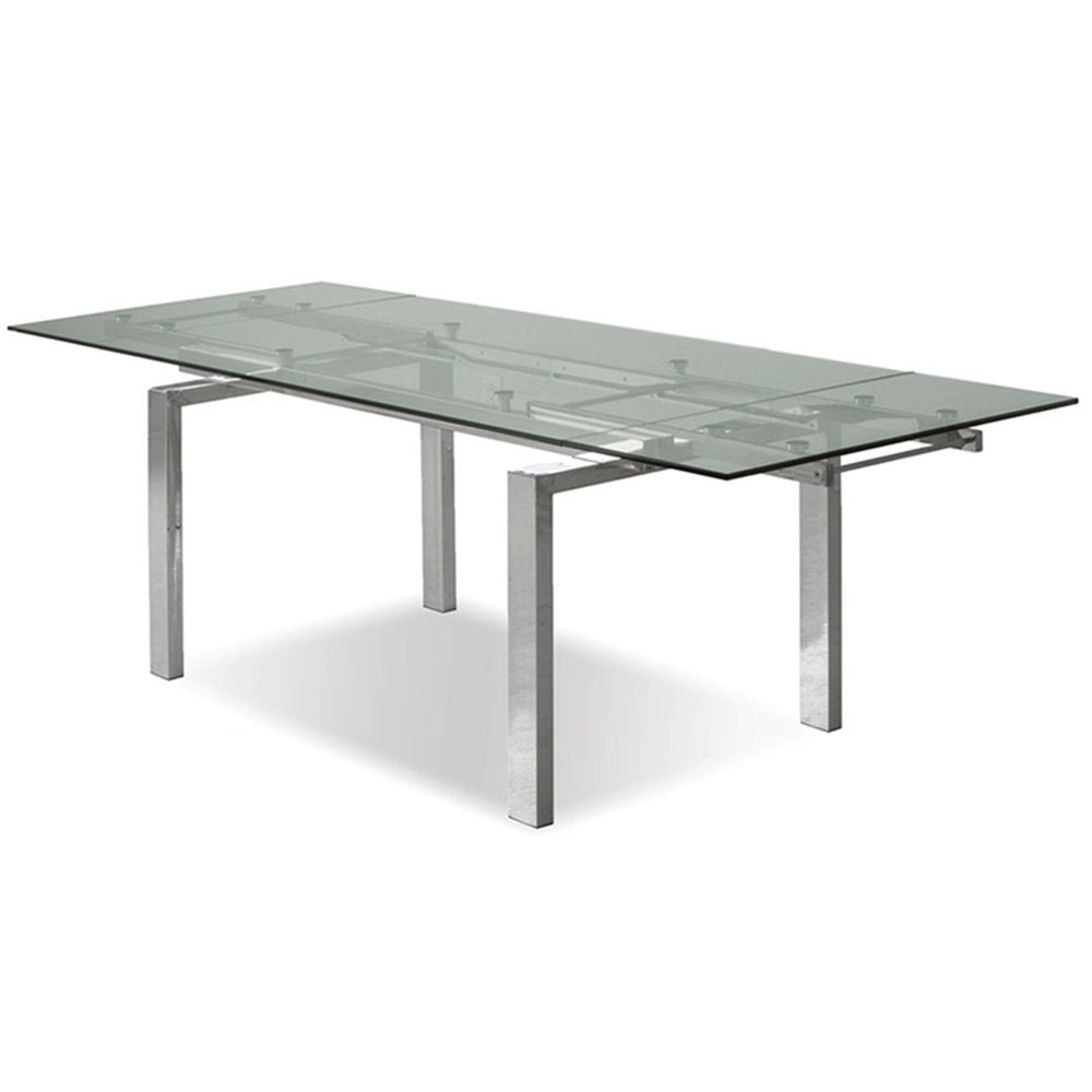 The Clearwater table has an industrial look with all of its gears’ glides and glass exposed. It boasts two manually adjustable extensions that pull from each end on durable and quiet nylon glides. The base is constructed in brushed stainless steel and is perfect to seat six every day or expand and get up to ten for special occasions.