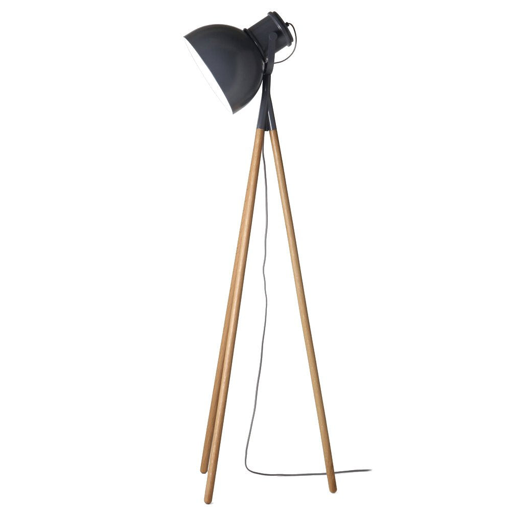 The Iwo Floor Lamp features a large lamp atop a thin tapered tripod base in light natural wood.