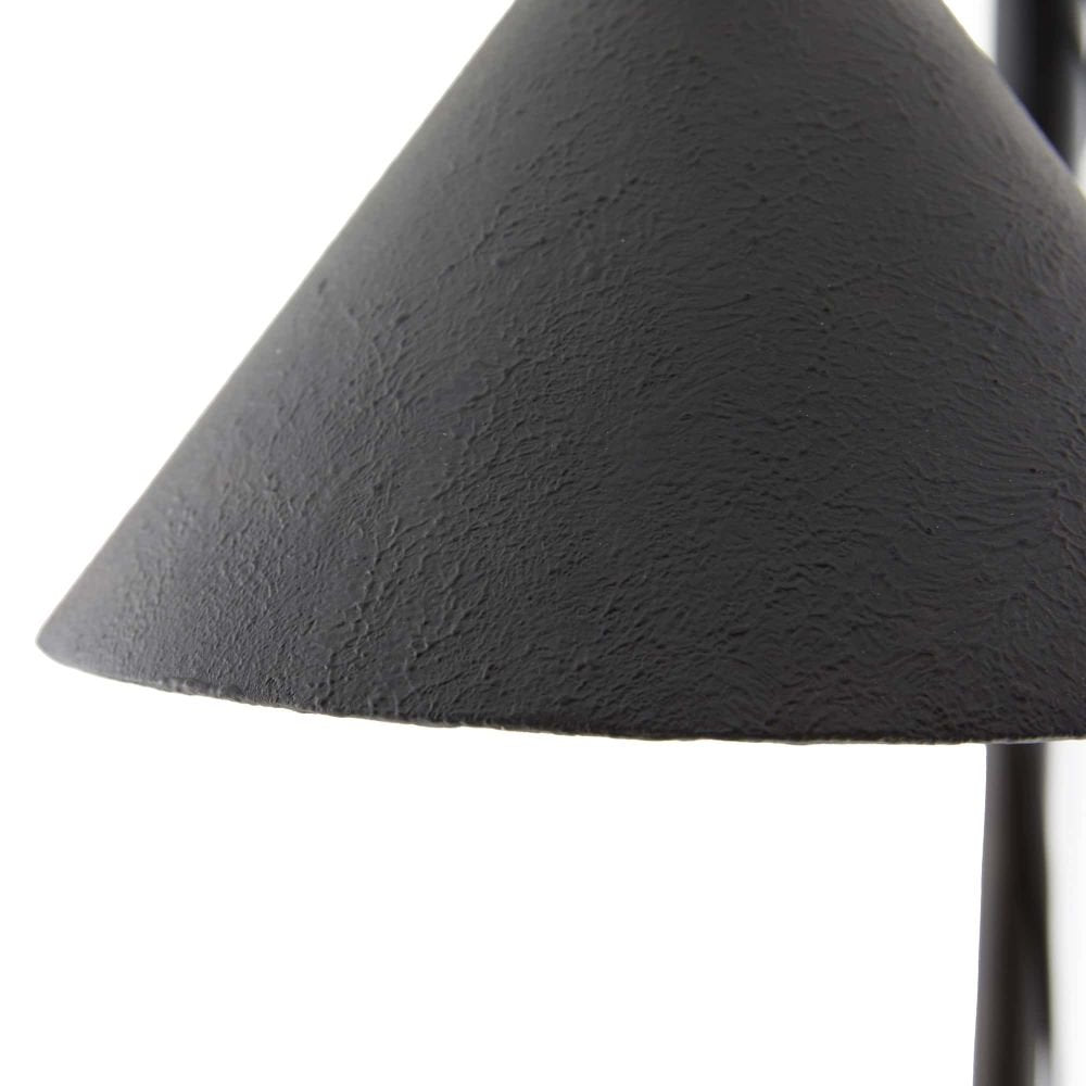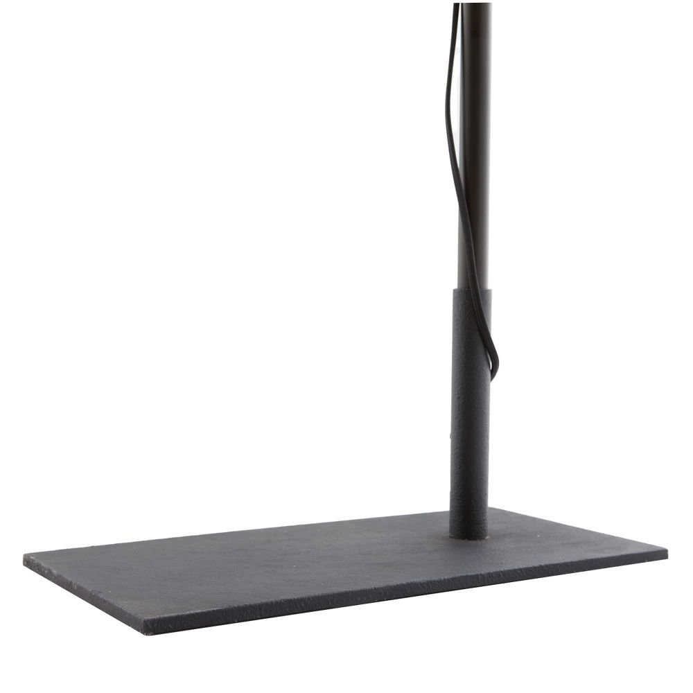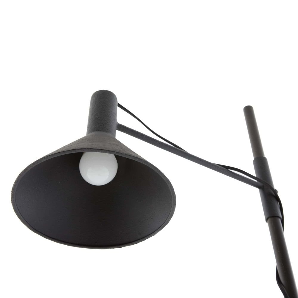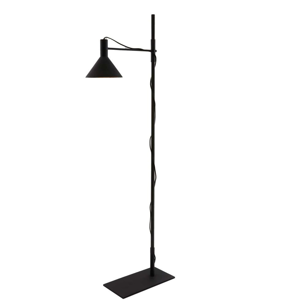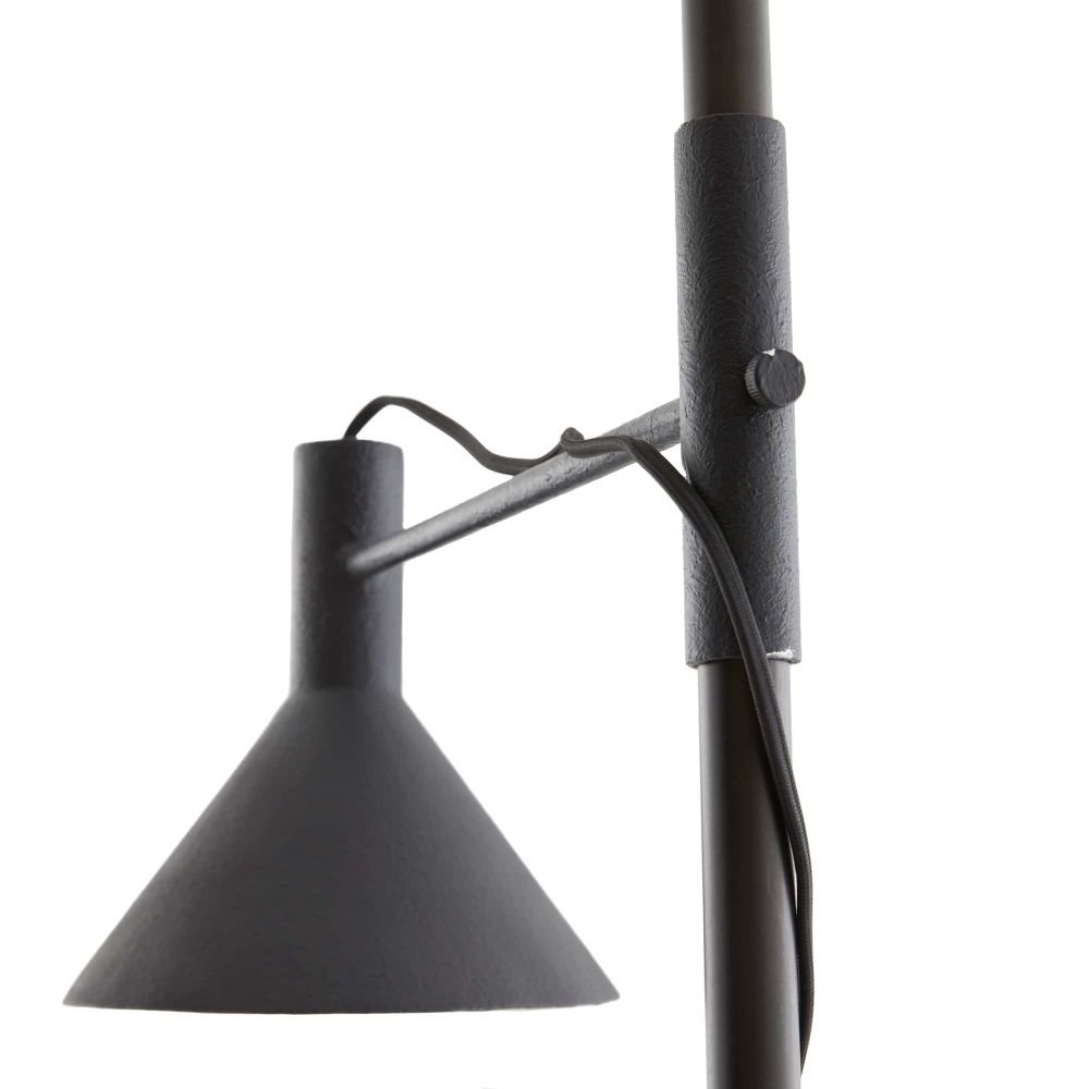 This floor lamp, in a textured matte charcoal iron is designed with a task-lamp profile and an industrial nod. The directional light features an intentionally exposed, blakc cloth cord. The cord could be artfully wrapped around the base rod of the lamp or can be left to simply hang straight.