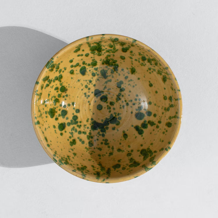 Handcrafted ceramic bowls in ochre glaze covered with green splatters that add authentic artisanal character to your table. Available in three versatile sizes, each piece is individually painted using traditional Moroccan techniques.