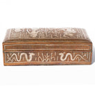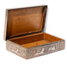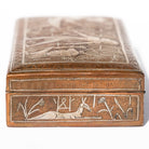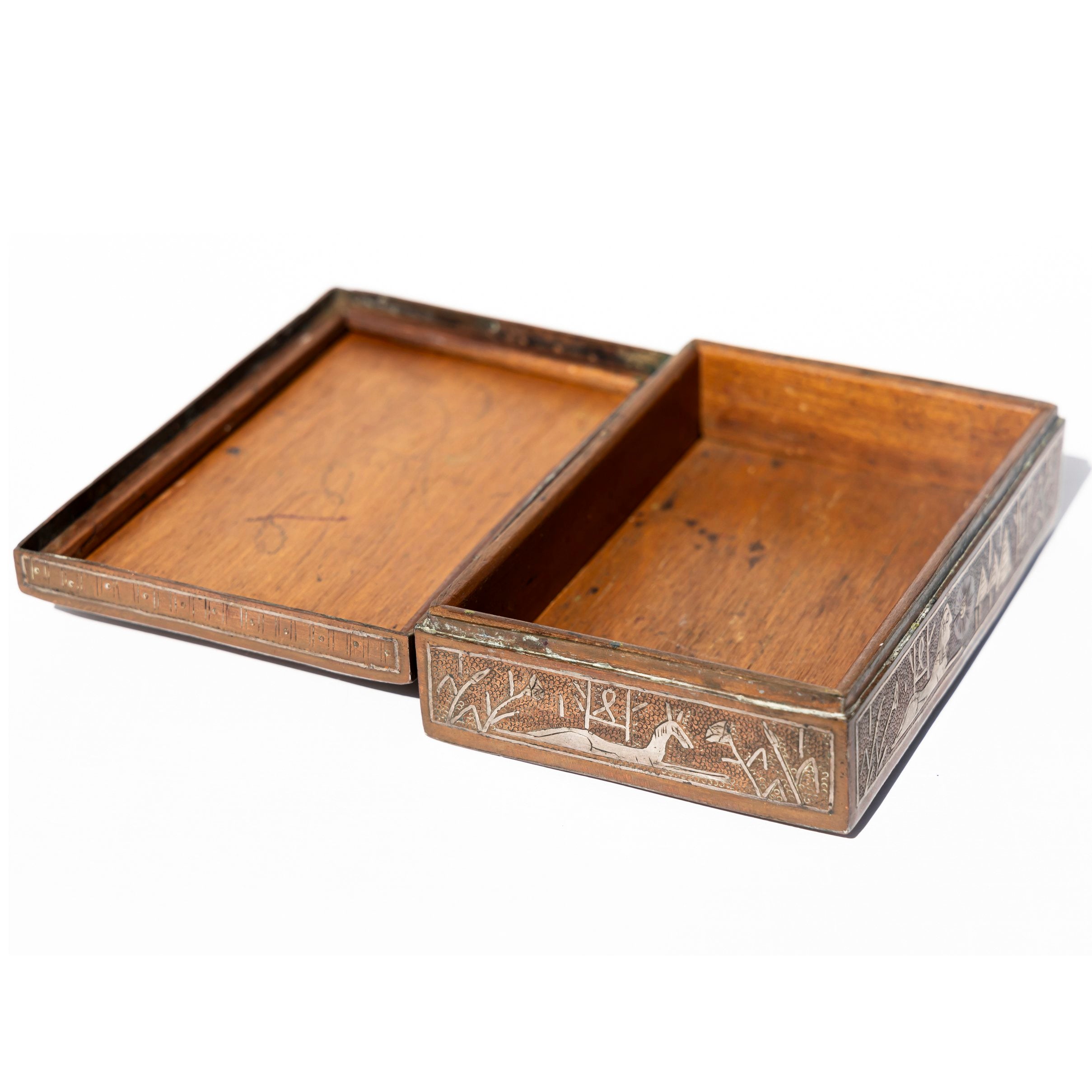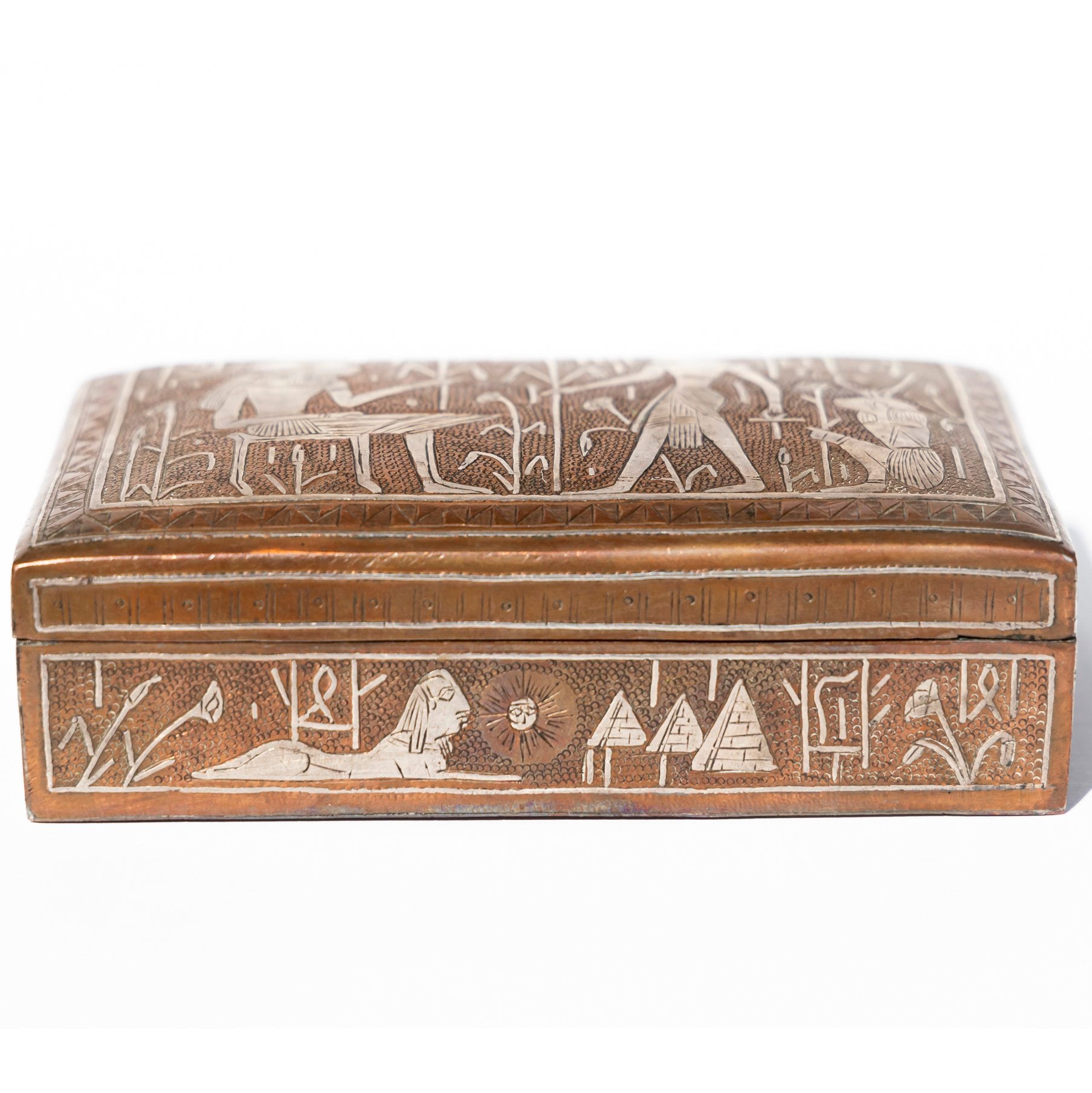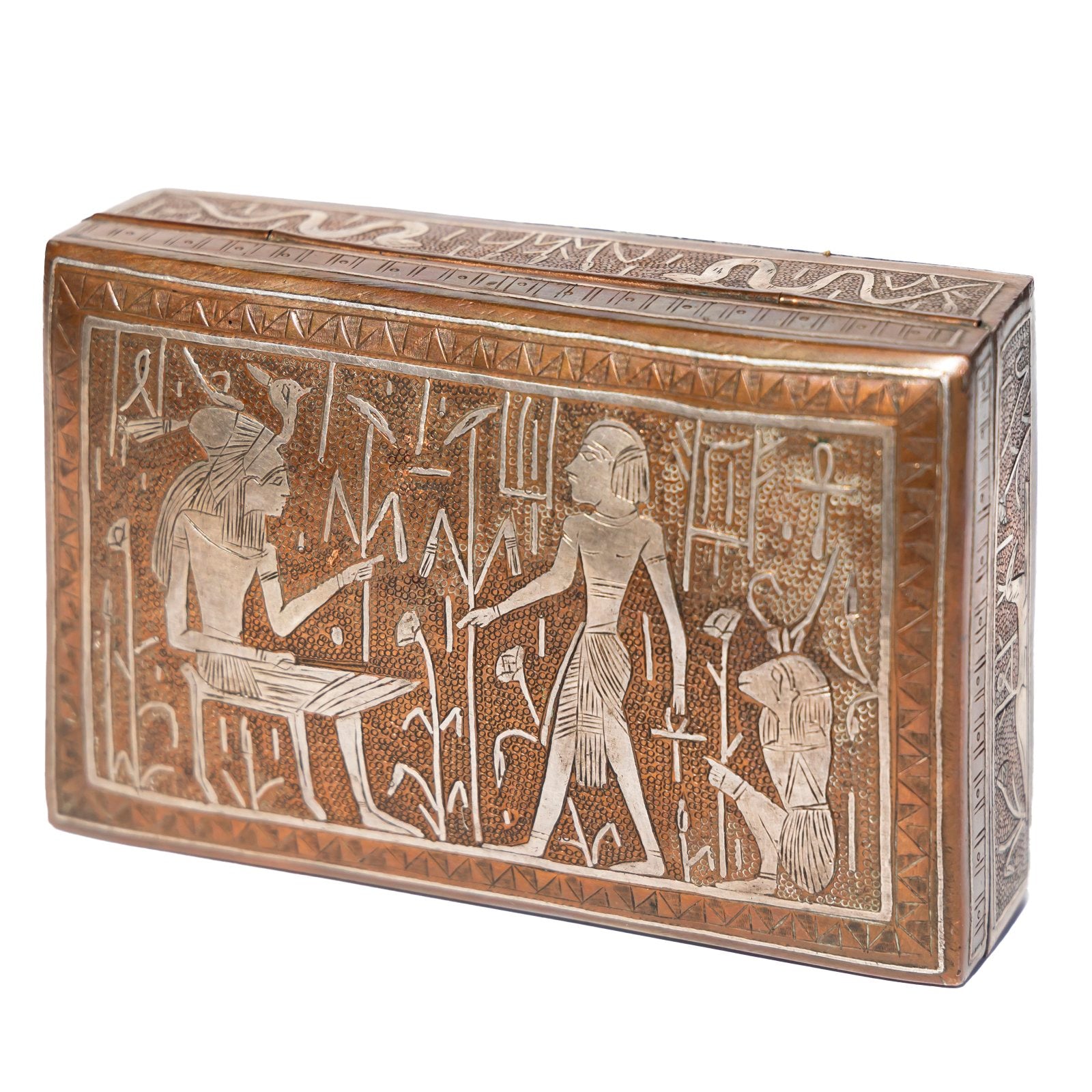 A small copper box with silver inlay features incredible detail and Egyptian-inspired motifs. It is of excellent quality for being over 100 years old and has a wooden interior.