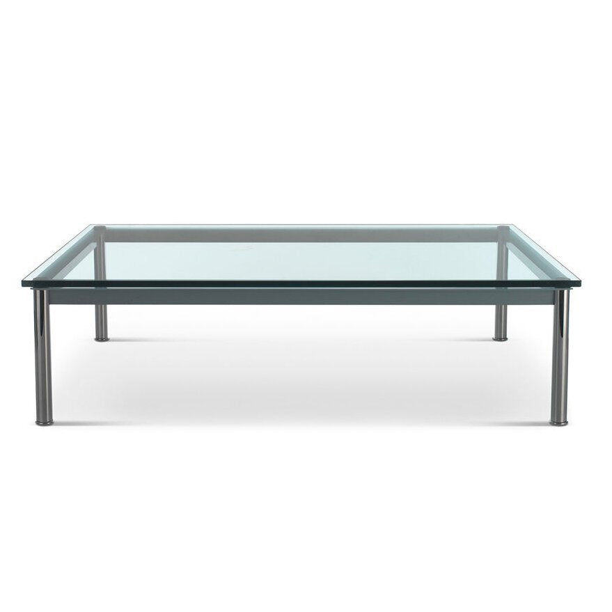 The LC10-P low table is an elegant piece that complements the other models in the Le Corbusier collection. It is offered in various sizes and features a glass top supported by chrome legs and a steel frame.