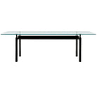 Iconic Italian dining or conference table adjustable in height to a range of approximately 2 inches (max 29" high), with structure in the following finishes: matte black – gloss light blue – matte black legs with a gloss grey stretcher. The tabletop is available in clear glass – textured glass – natural ashwood – ashwood stained black.