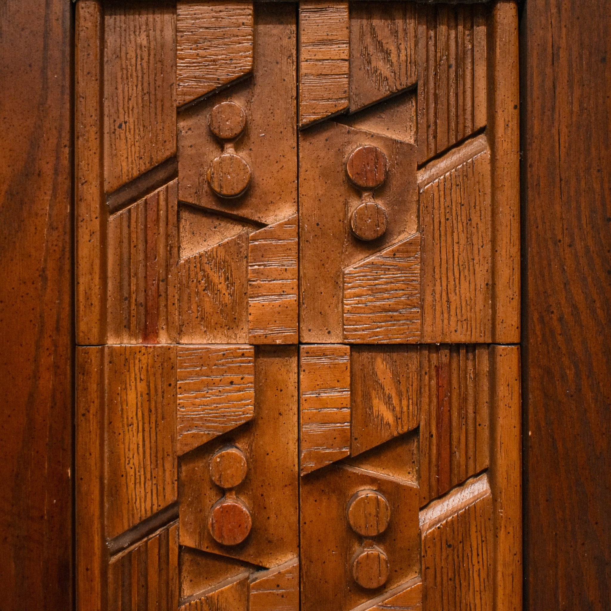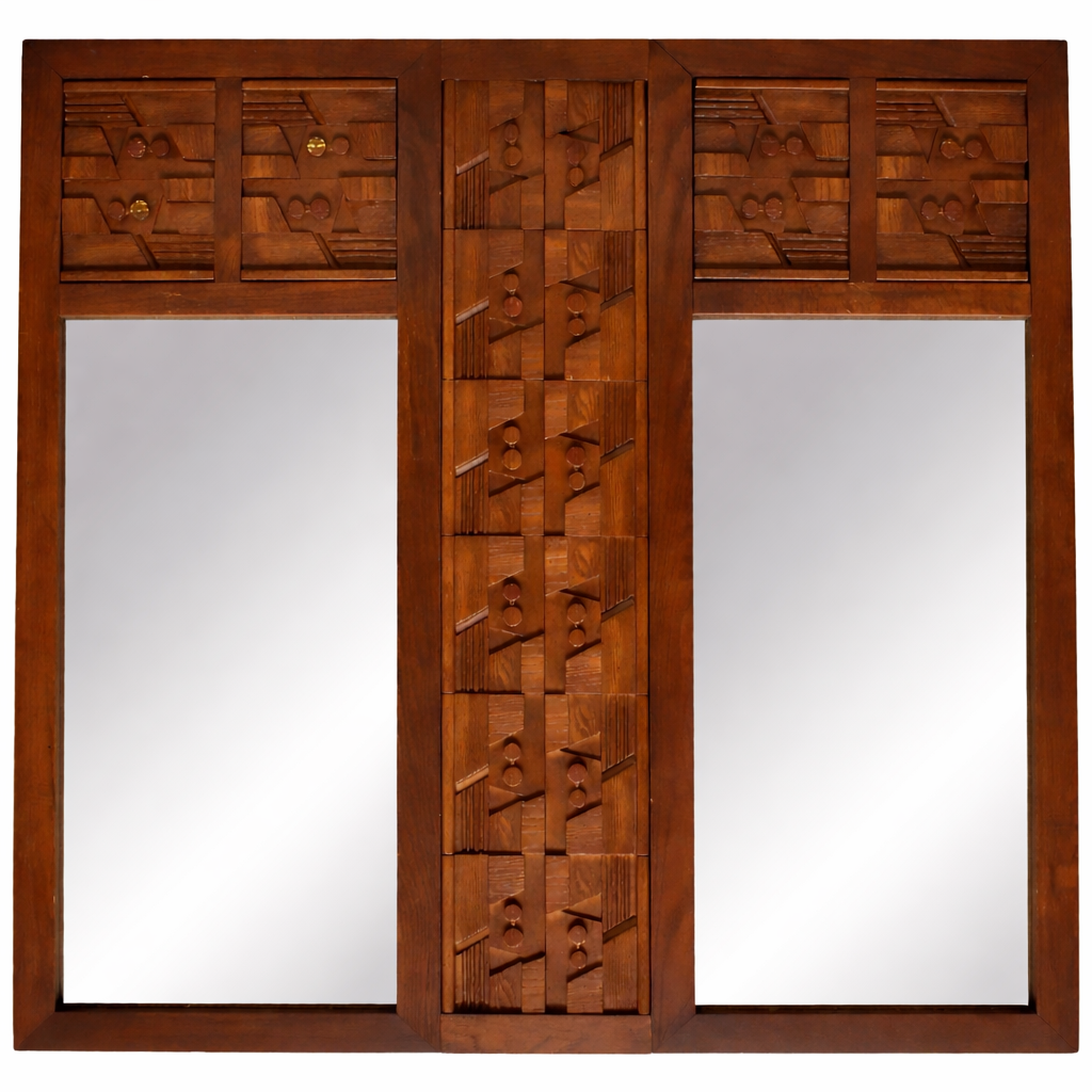 A striking large-scale mirror executed in the Brutalist idiom of the 1960s, crafted in rich walnut and designed in the style of Paul Evans. The divided mirror surface is framed by a deeply textured, hand-carved wood surround, featuring bold geometric relief that emphasizes depth, shadow, and materiality.